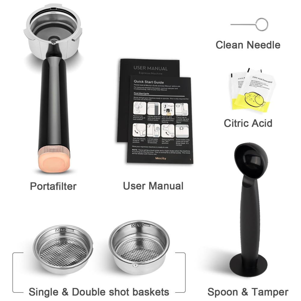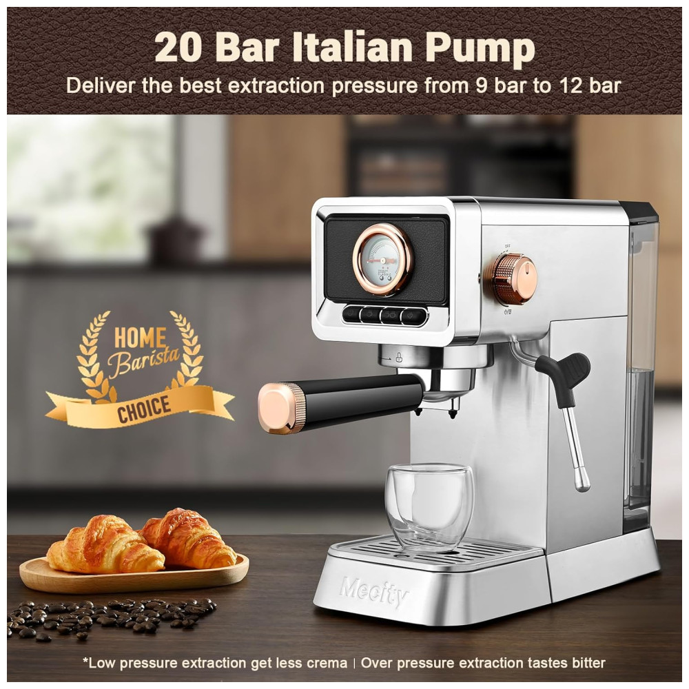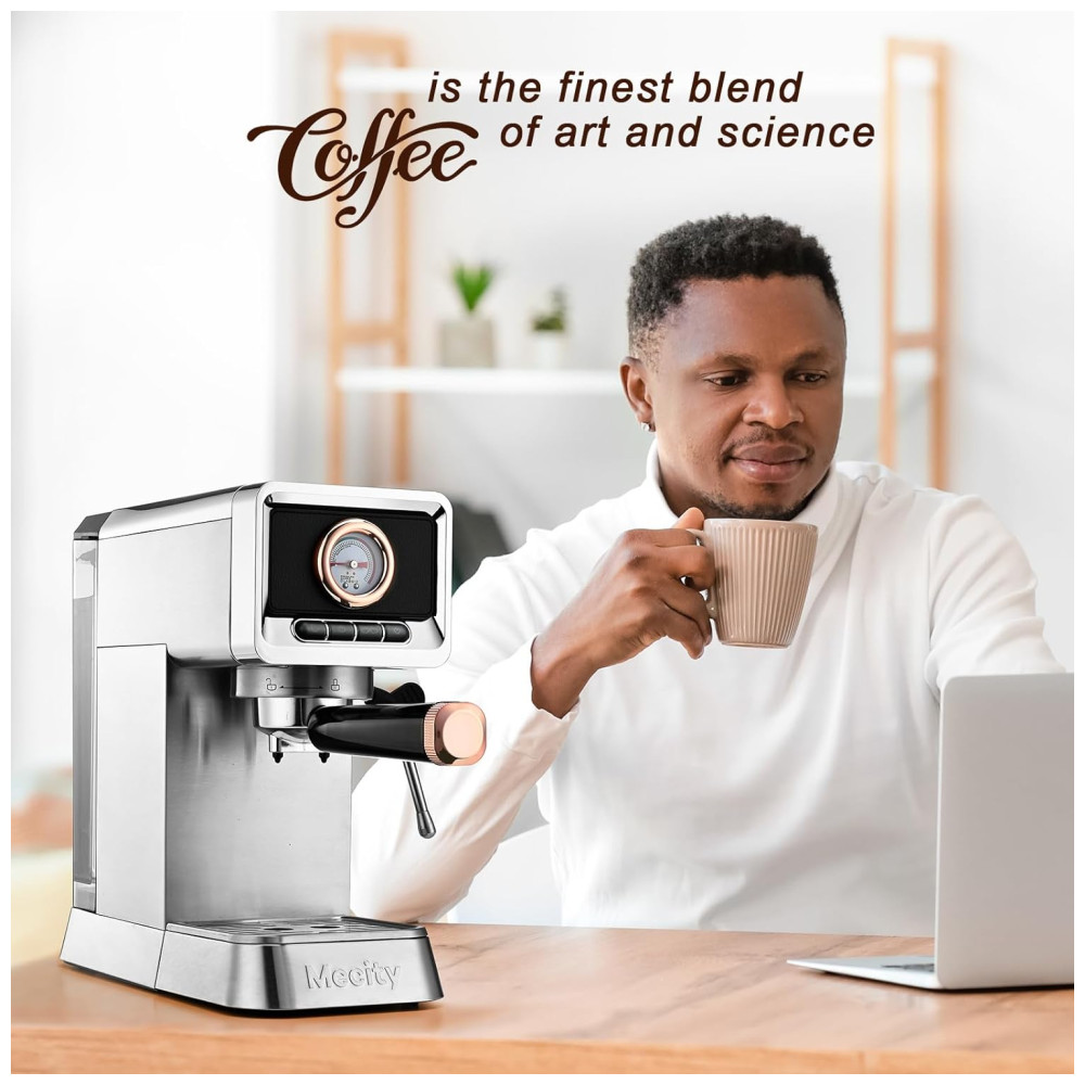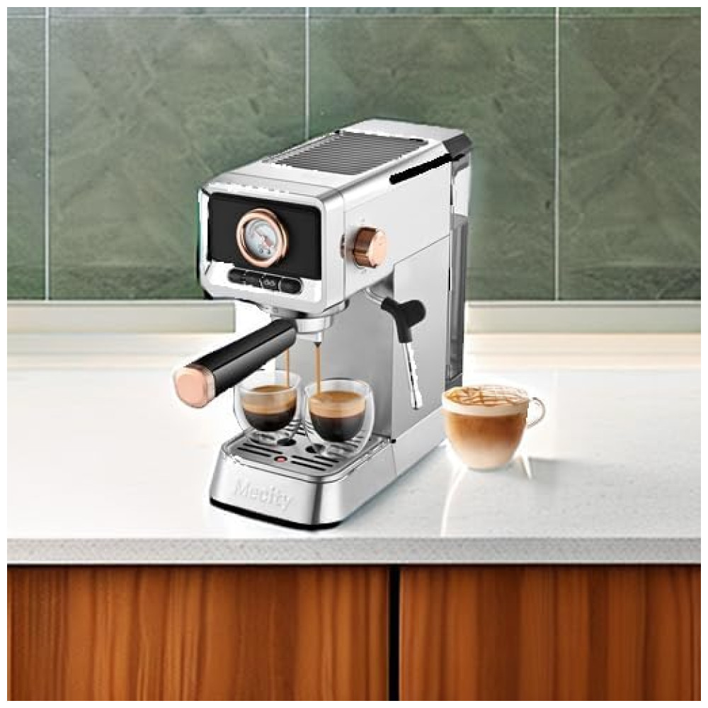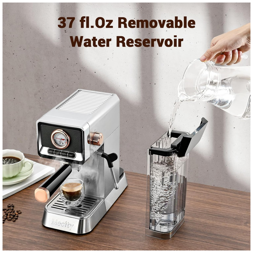 A máquina de espresso Mecity CM5203AY oferece 20 bar de pressão para extração de café espresso com crema consistente. Estrutura compacta em aço inoxidável escovado, mede 29,0 cm de profundidade, 13,0 cm de largura e 29,5 cm de altura, proporcionando fácil acomodação em cozinhas residenciais. Possui reservatório de água transparente e removível com capacidade para 1,09 litros, vaporizador de leite integrado para preparo de cappuccino, latte, mocha e americano, além de aquecedor de xícaras na parte superior. O sistema de preparo inclui pré-infusão dos grãos, controle preciso do fluxo de água e possibilidade de ajuste do volume, permitindo cafés mais suaves ou intensos. Painel de controle com botões, funcionamento semiautomático, filtro reutilizável e bandeja de resíduos removível para facilitar a limpeza. Alimentação em 120V e potência de 1400W. Recomendada para uso doméstico, não inclui acessórios promocionais.