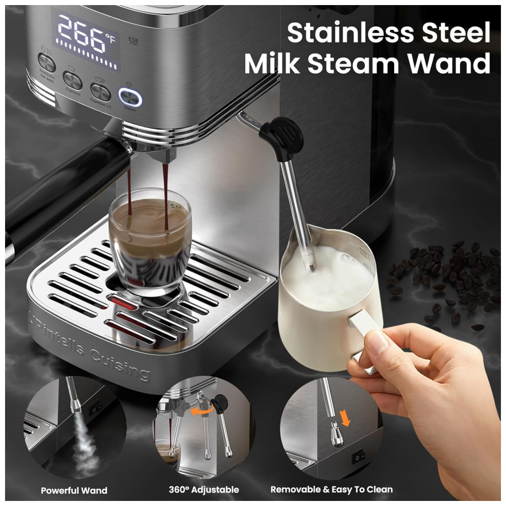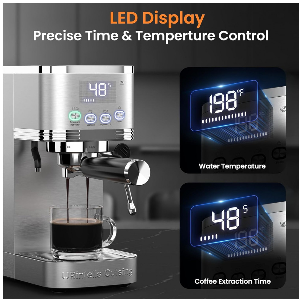 Máquina de Café Expresso 20 Bar com Display LED Vaporizador de Leite e Filtro de Cápsula ESE 110V 1350W URintells Prata