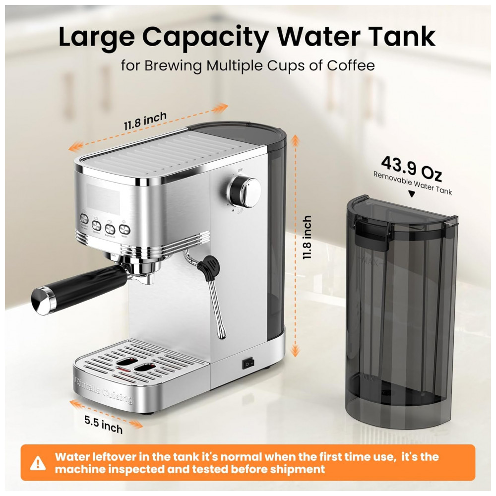 Componentes Incluídos: Manual de instruções, Máquina de café expresso com vaporizador de leite, Tanque de água removível de 44 oz (aproximadamente 1,3 L), Filtro de uma xícara de 51 mm, Filtro de duas xícaras de 51 mm, Filtro de cápsula ESE, Porta filtro de aço inoxidável de 51 mm, Tamper com colher