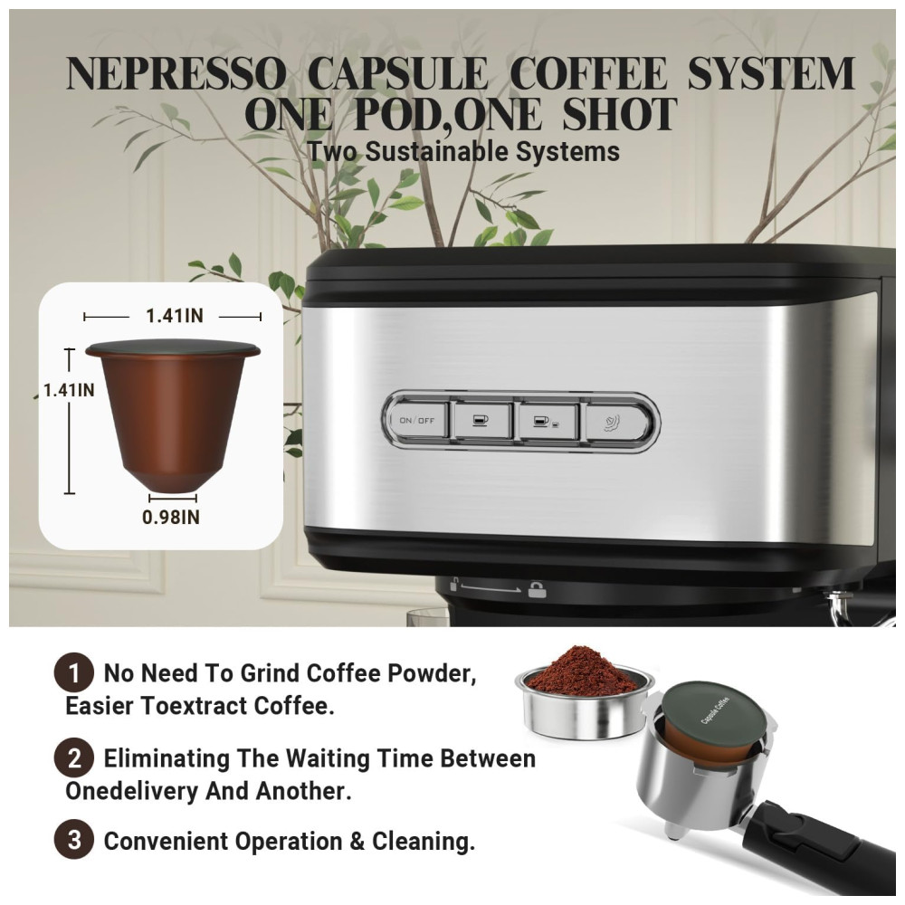 A máquina é equipada com filtros para cápsulas de café em pó, que podem se adaptar a diferentes métodos de preparo de café. Observe que algumas cápsulas podem não funcionar com nossas máquinas de café. As cápsulas não estão incluídas com a máquina.