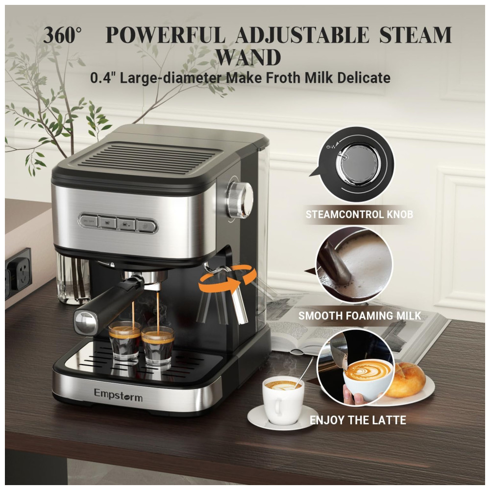 Além disso, a máquina de cappuccino é equipada com um tubo de vapor ajustável em 360 graus, tornando a conveniente para você fazer café com leite, cappuccino e outros cafés expressos em casa ou no escritório. O bocal de espuma removível facilita a limpeza.