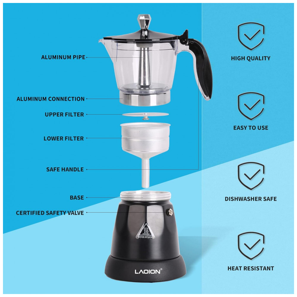 Material e de qualidade alimentar A panela superior desta máquina de café expresso elétrica é feita de plástico livre de BPA e resistente ao calor, a panela inferior é feita de alumínio premium de qualidade alimentar, não tóxico e à prova de ferrugem.