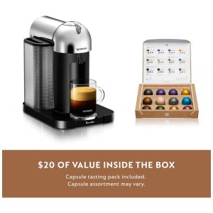 A máquina de café e expresso Nespresso Vertuo prepara 5 tamanhos de xícara de dose única, tudo com o toque de um botão. Cada máquina inclui um conjunto de boas vindas gratuito com uma variedade de cápsulas Nespresso Vertuo com perfis de aroma exclusivos. A máquina Nespresso Coffee and Espresso da Breville utiliza cápsulas de dose única de tamanho duplo para preparar café ou expresso com sabor consistente com o toque de um botão. A Nespresso Vertuo usa cápsulas grandes para café e pequenas para expresso e possui tecnologia patenteada de extração Centrifusion lê o código de barras na borda de cápsulas de dose única compatíveis e define automaticamente os parâmetros de preparo