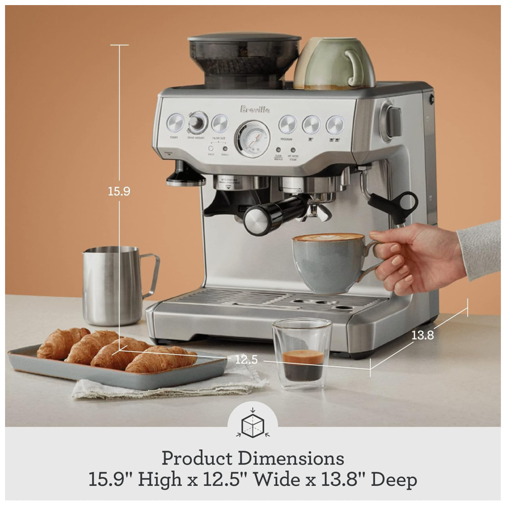 O Breville Barista Express oferece café especial de terceira onda em casa usando a fórmula de 4 chaves e faz parte da Série Barista que oferece máquinas de expresso com moedor integrado para ir de grãos a expresso em menos de um minuto