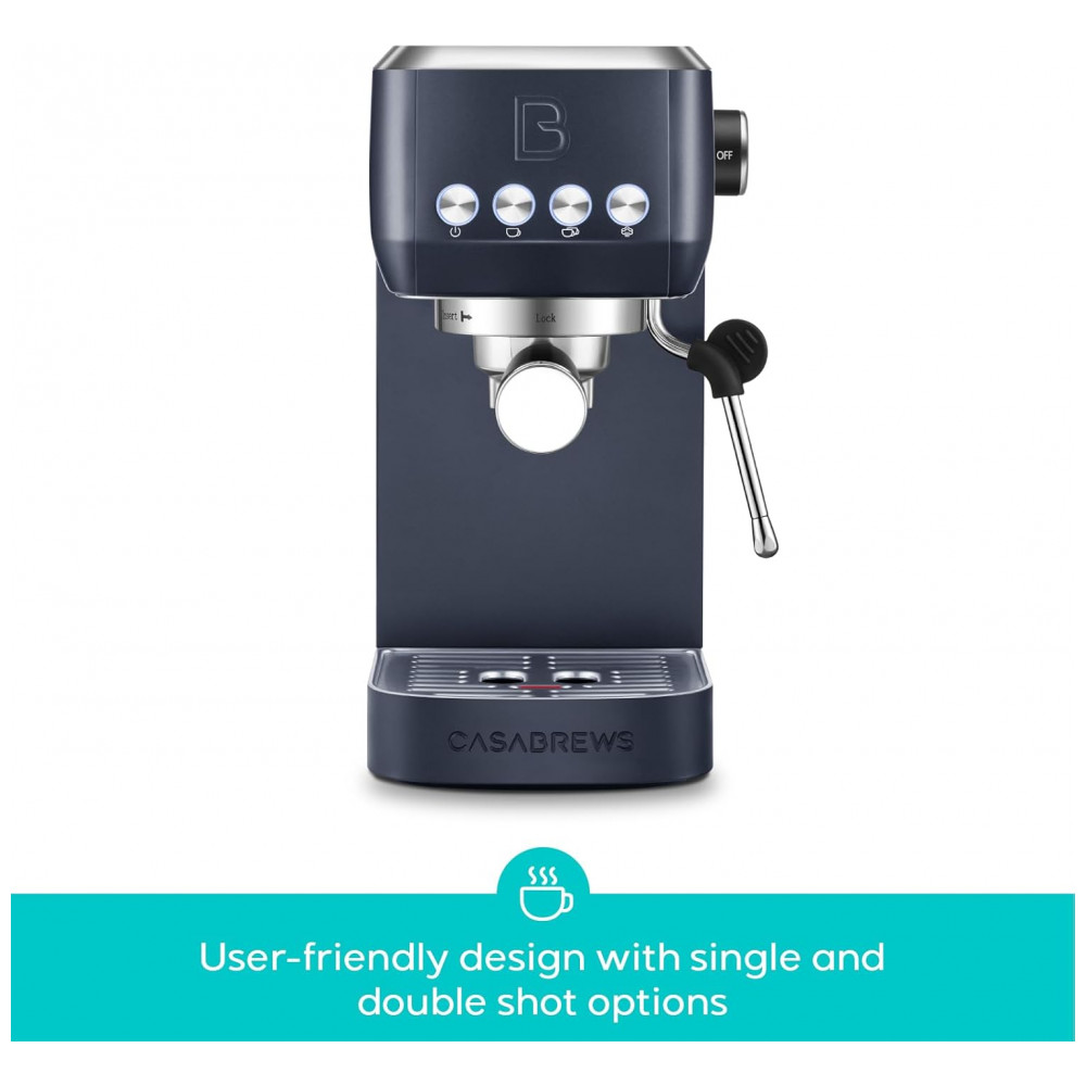 Desfrute da experiência de um café estilo barista em casa com a máquina de café expresso CASABREWS 20 Bar, em elegante Azul Safira. Prepare suas bebidas favoritas como lattes, cappuccinos e macchiatos no conforto da sua casa ou escritório. Com um acabamento arrojado e sofisticado em aço inoxidável durável, esta máquina adiciona um toque de luxo moderno a qualquer bancada. Produza uma espuma de leite sedosa a cada xícara, com o poderoso bico de vapor integrado a esta compacta máquina de café expresso. Crie um microfoam cremoso que eleva o sabor e a aparência do seu café – ideal para latte art e para aprimorar sua bebida matinal. Com um sistema de extração poderoso de 20 Bar e um motor de alto desempenho de 1350W, esta cafeteira assegura uma extração ideal para um sabor forte e aroma rico. Seja fazendo um espresso intenso ou um flat white suave, você sentirá a diferença em cada xícara. Projetada para se integrar perfeitamente em qualquer cozinha, esta máquina de café expresso economiza espaço e possui um reservatório de água removível de 1240ml para múltiplas preparações sem a necessidade de reabastecer com frequência. Fácil de limpar, possui bandeja removível e vem com tudo que você precisa para começar: Máquina de Café Expresso, Reservatório de Água de 1240ml, Filtros de Café para uma e duas xícaras, Porta-filtro, Socador com colher e Manual do Usuário. Antes de usar a máquina, siga as dicas rápidas para a primeira utilização e consulte a loja CASABREWS para obter vídeos tutoriais úteis e documentação na seção de guias do produto.