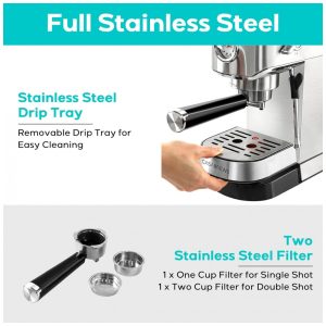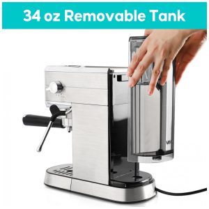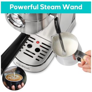 Sistema de Espuma de Leite Nossa máquina de café expresso com batedor de leite possui uma poderosa varinha de vapor, para que você possa dar textura ao leite cremoso e rico em microespuma para criar uma incrível arte de espuma de leite e realçar o sabor de suas cervejas. Desperte seu barista interior e crie sua própria arte exclusiva de espuma de leite. Não nos deixe passar se procura uma excelente máquina de café expresso