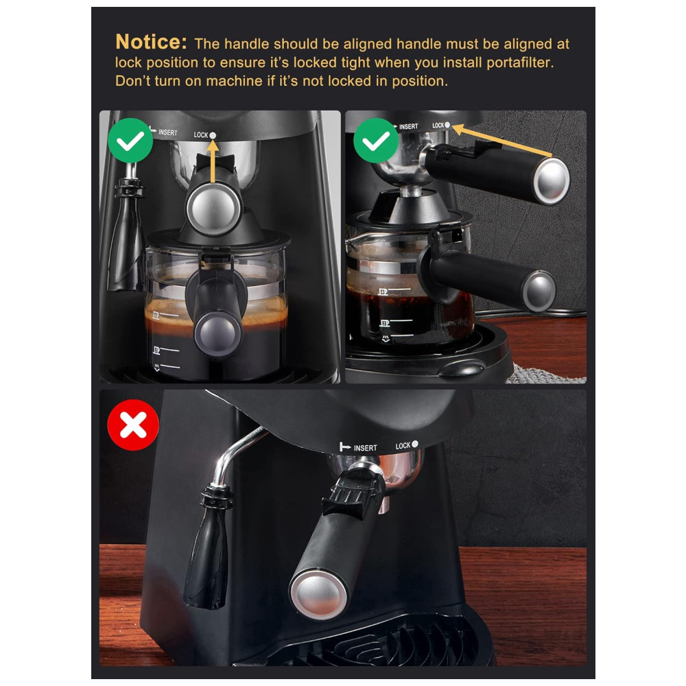 Ao instalar o porta filtro, sua alça deve estar alinhada na posição travada para garantir que esteja bem travado. Para garantir o sabor máximo, use pó de café médio grosso