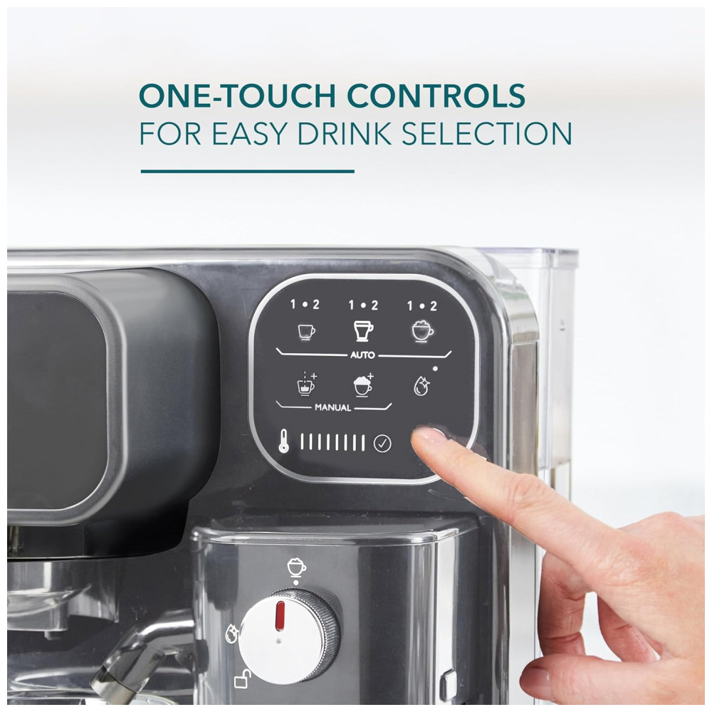 Com a Máquina de café expresso Coffee Prima Latte Luxe, você pode desfrutar de café expresso, cappuccino e latte em nível de cafeteria, com o toque de um botão. Seja seu próprio barista enquanto prepara, espuma e cria doses simples ou duplas de café expresso, lattes ou cappuccinos, além de um espumador de leite otimizado que oferece resultados de microespuma aveludados com qualquer leite, incluindo aveia. A bandeja coletora ajustável permite que você prepare diretamente em uma caneca de viagem, para que possa levar seu café favorito onde quer que vá.
