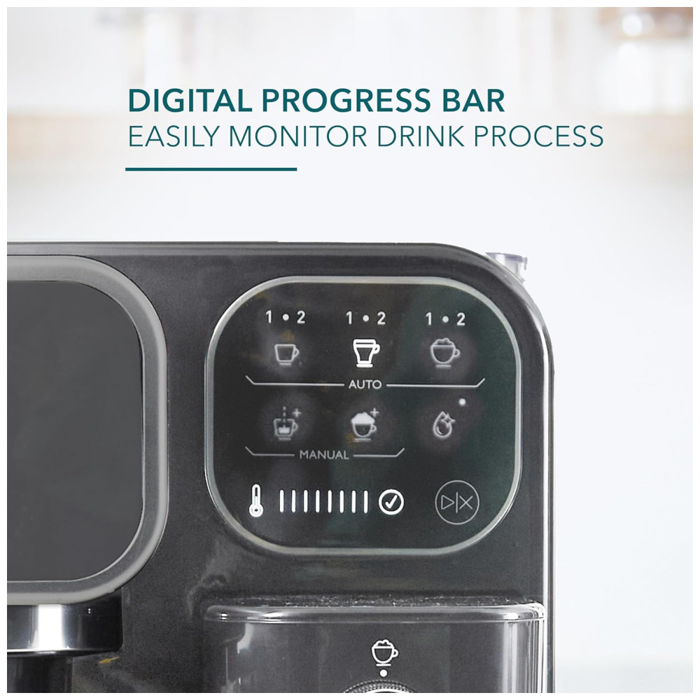 A barra de progresso digital iluminada exibe atualizações de aquecimento e preparação em tempo real para resultados perfeitos sempre. A máquina inclui um compactador de café ergonômico e uma colher menos suja para ajudar a manter os grãos onde eles pertencem. Os tanques de água e leite podem ser facilmente removidos, e o tanque de leite de tamanho generoso de 800 ml também possui uma tampa para armazenamento sem derramamentos.