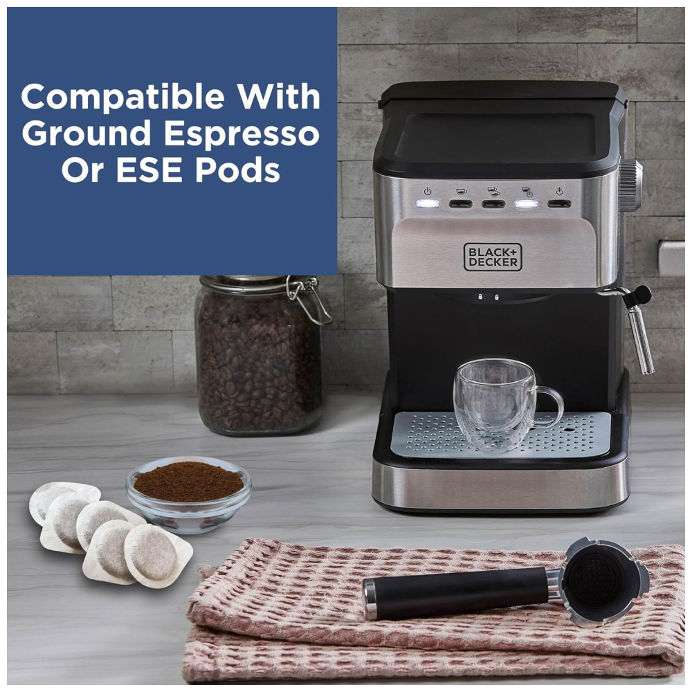 Máquina de Café Expresso e Cappuccino Semi Automática 15 Bar com Opção de Grãos ou Cápsulas ESE 110V 1000W BLACK+DECKER Preta