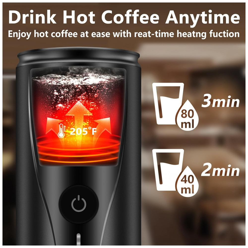 Máquina de café expresso portátil atualizada: Devido ao design compacto, nossa mini cafeteira se tornará seu item obrigatório em qualquer lugar, café expresso fácil Aumentamos a função de proteção, que, ao detectar a ausência de água no interior, ativará uma proteção de segurança contra queima a seco. O design isolado garante que não haja danos térmicos.