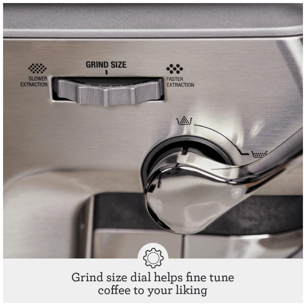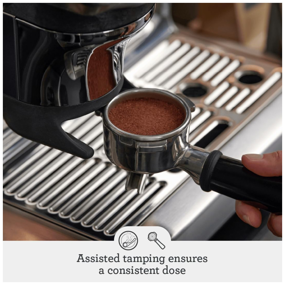 A compactação assistida inclui um acabamento de torção de barista de 7 graus e uma pressão consistente de 10 kg, resultando em uma superfície de disco polida e uma compactação uniforme. O moedor de rebarbas cônico integrado oferece 25 configurações de moagem, permitindo ajustar o tamanho da moagem para obter o sabor e a extração desejados.