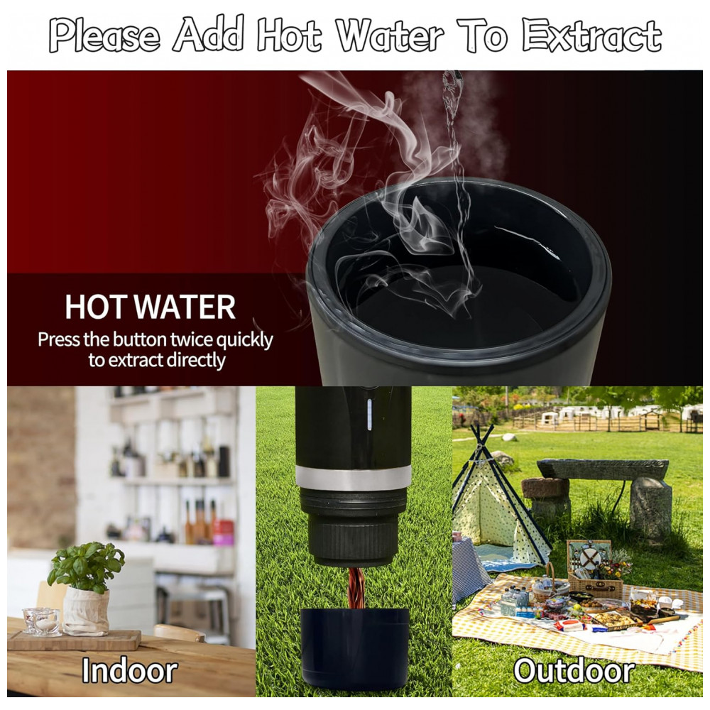 Função dois em um: Melhore a eficiência da bateria e prepare mais uma xícara de café do que produtos similares. Bateria recarregável de 7500mAh integrada, pode preparar 4 5 xícaras depois de totalmente carregada. 1. Preparação a frio: Adicione água fria e pressione duas vezes rapidamente o botão para extração direta. 2. Prepare com água quente e água morna: Adicione água quente e pressione duas vezes o botão para extrair diretamente.