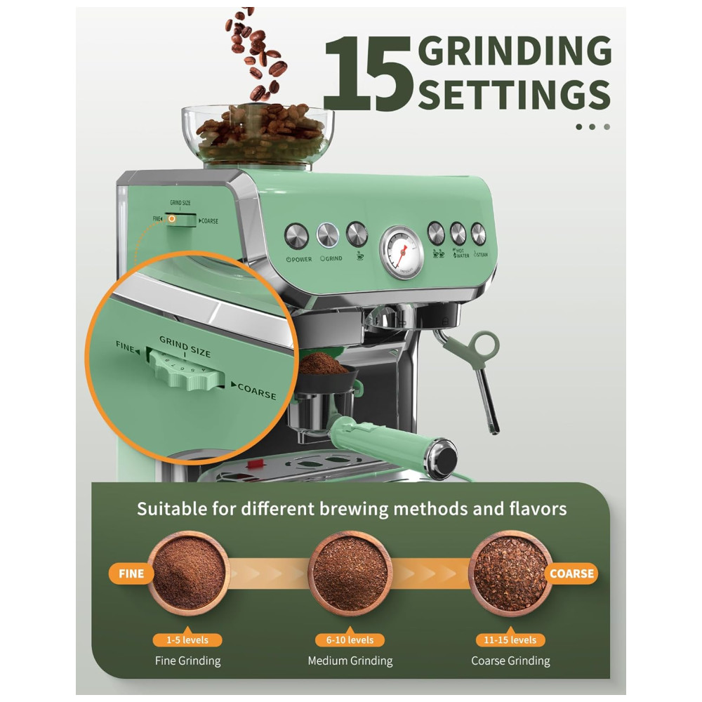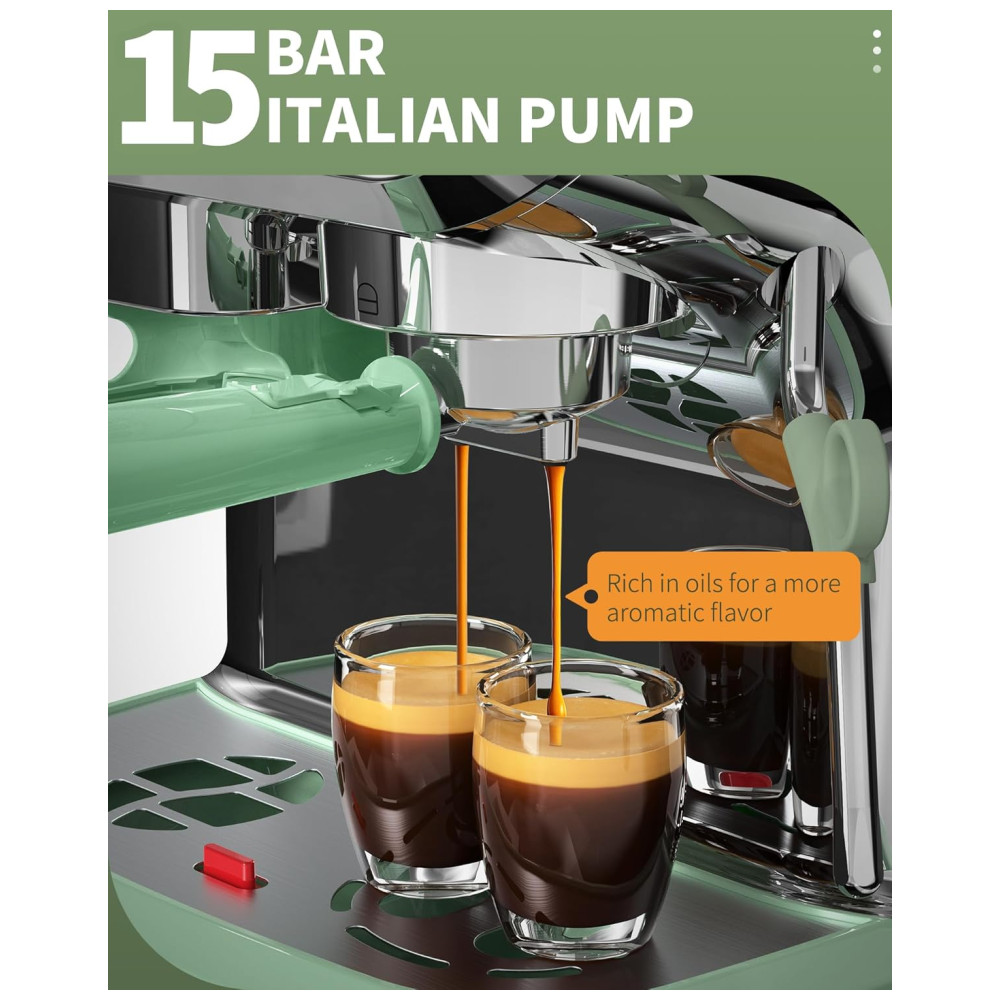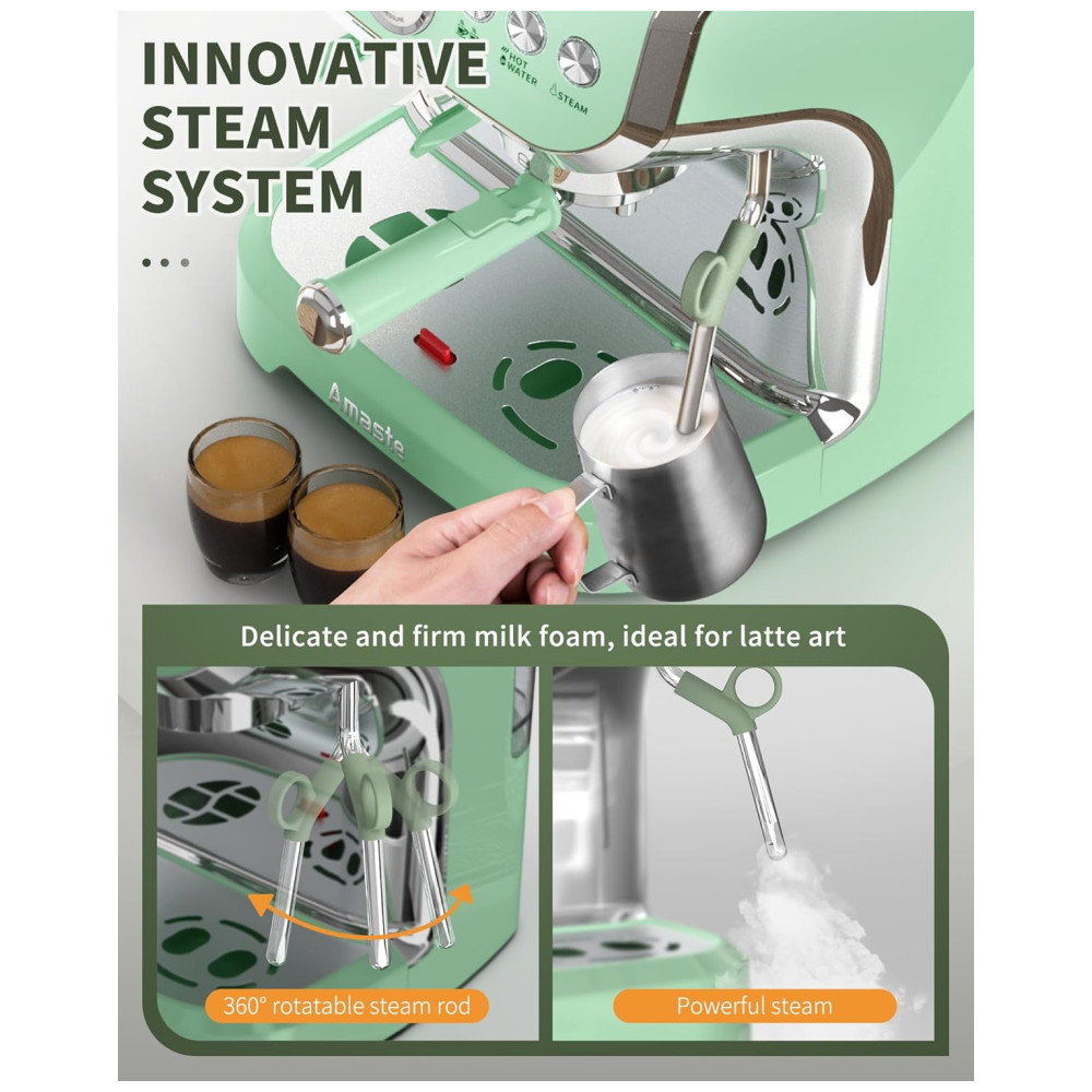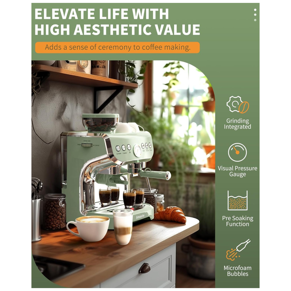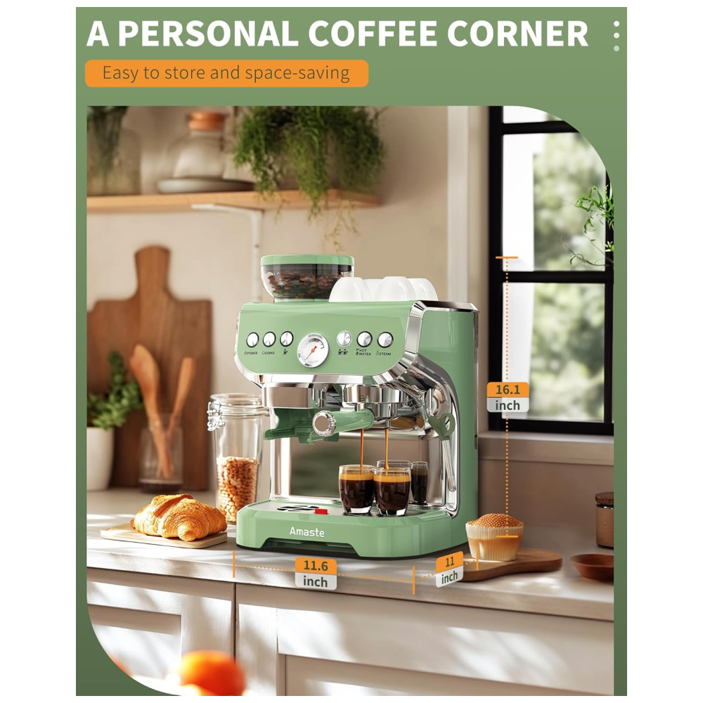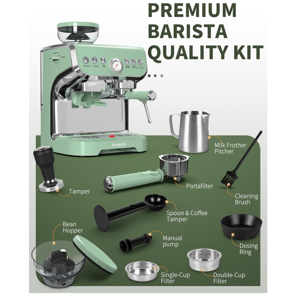 Máquina de Café Expresso Profissional 15 Bar com Vaporizador de Leite Moedor Embutido e Tanque de Água Removível de 2L 110V 1450W Amaste AC-517E Verde