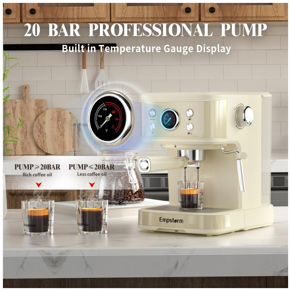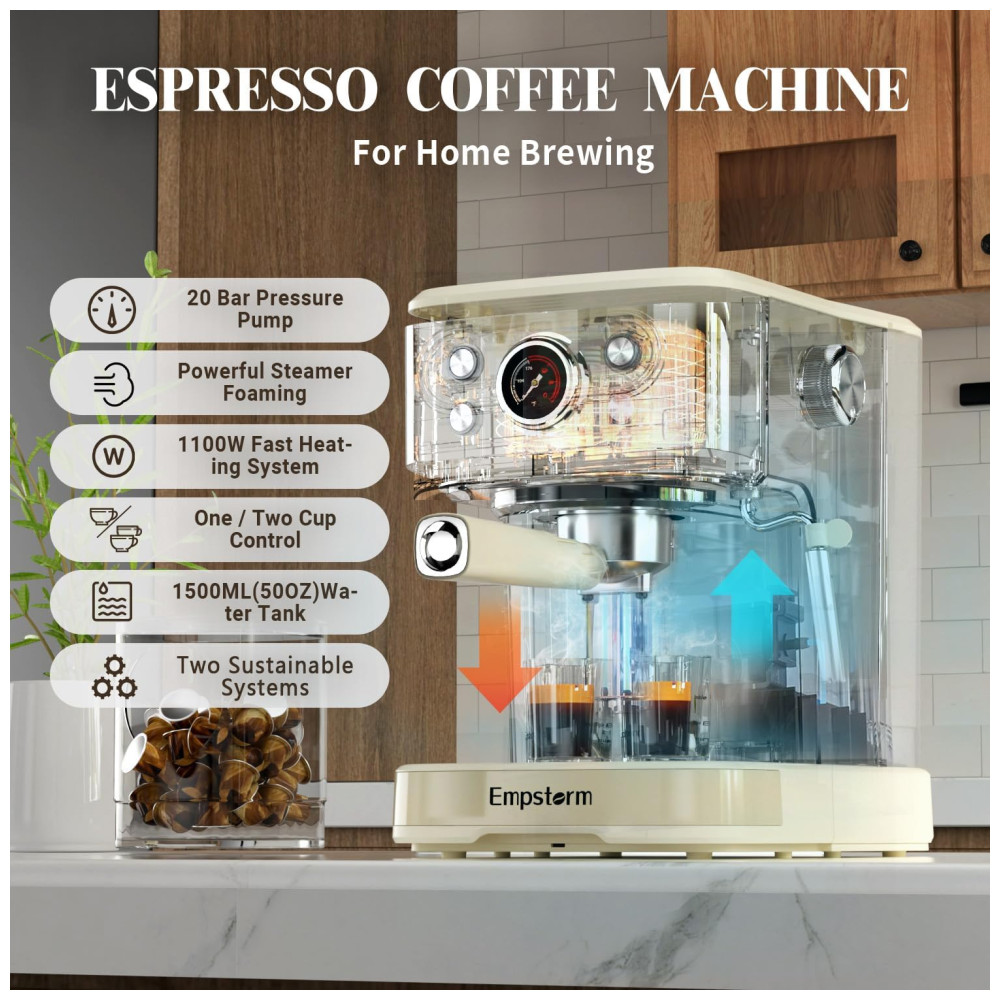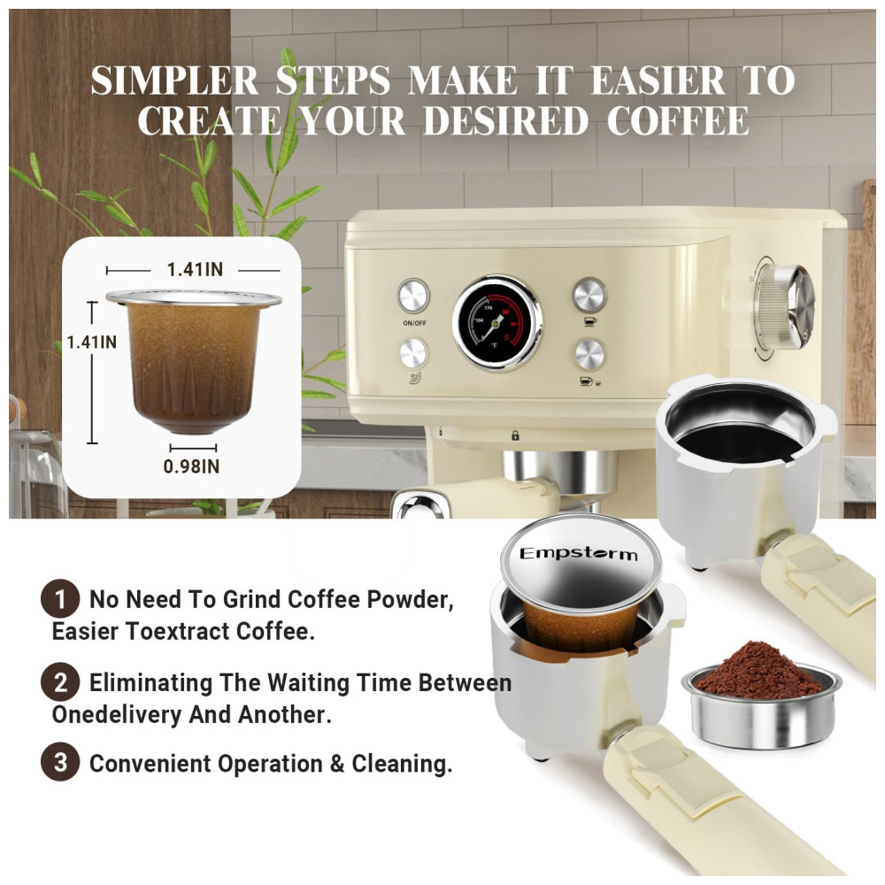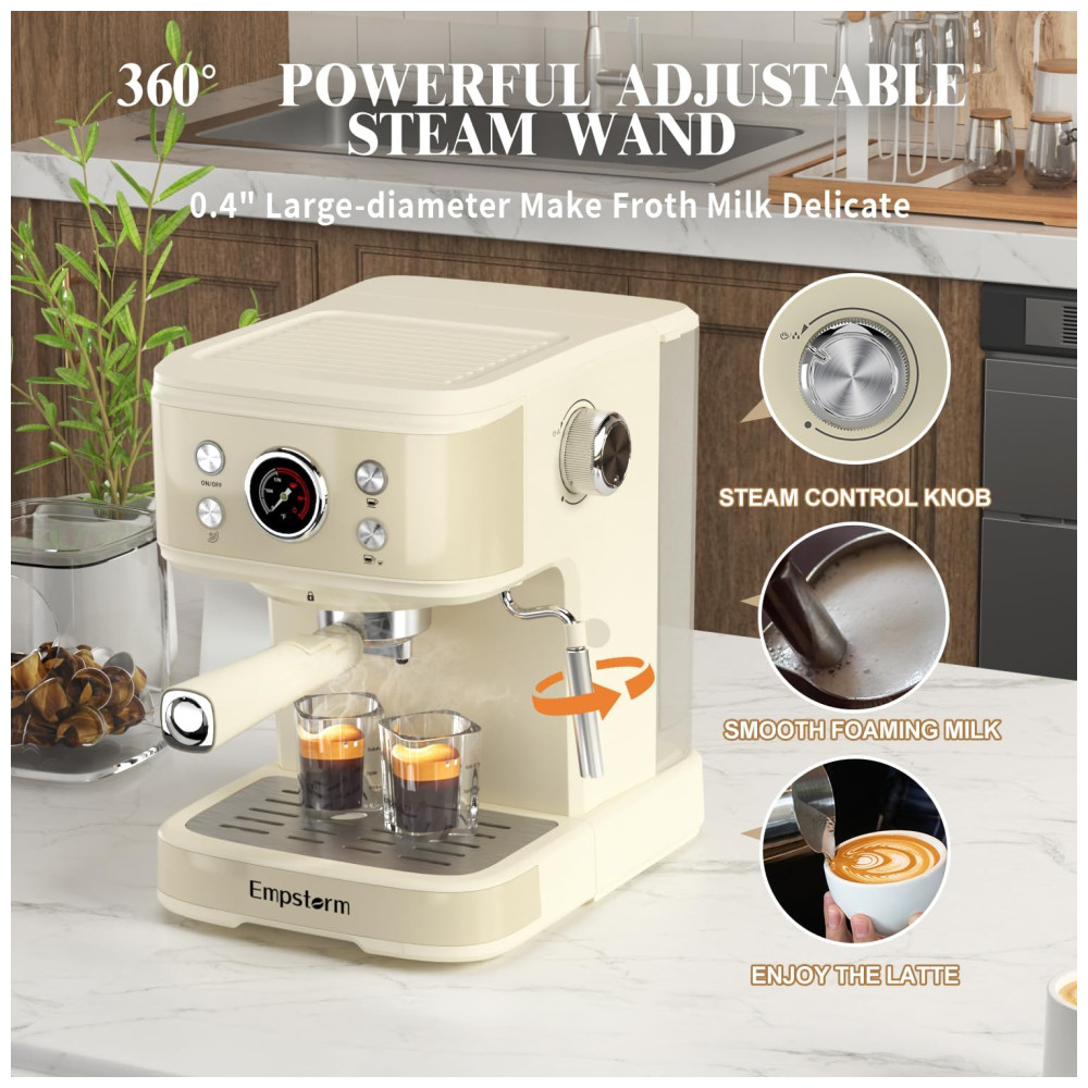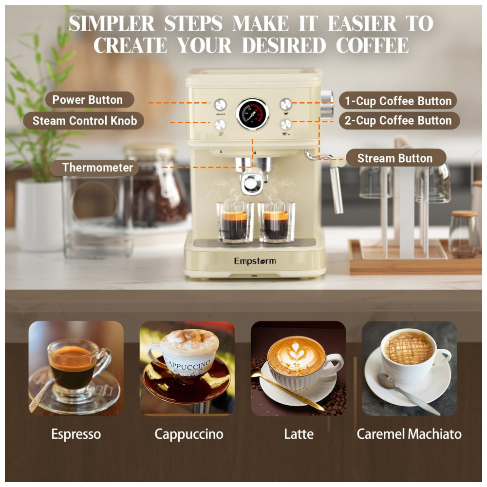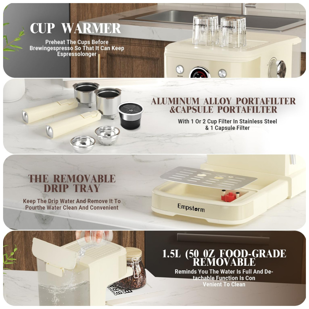 Com uma interface amigável de quatro botões, um tubo de vapor ergonomicamente inclinado e um clipe conveniente, a máquina de café expresso Empstorm é fácil e segura de usar. Além disso, possui um tanque de água transparente removível e uma bandeja coletora facilmente removível, o que simplifica significativamente a rotina de limpeza.