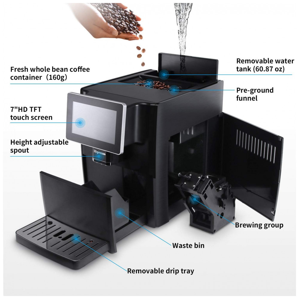11 Modelos Personalize a configuração para expresso,americano,cappuccino,latte,macchiato,latte macciato,flat white,hot milk and hot water.o Hipresso permite programar tudo,dose,temperatura,Do volume de leite e expresso a dose,Perfil do usuário.Uma vez você tem suas bebidas favoritas discadas, você pode salvá las em seu perfil dedicado para facilitar o acesso