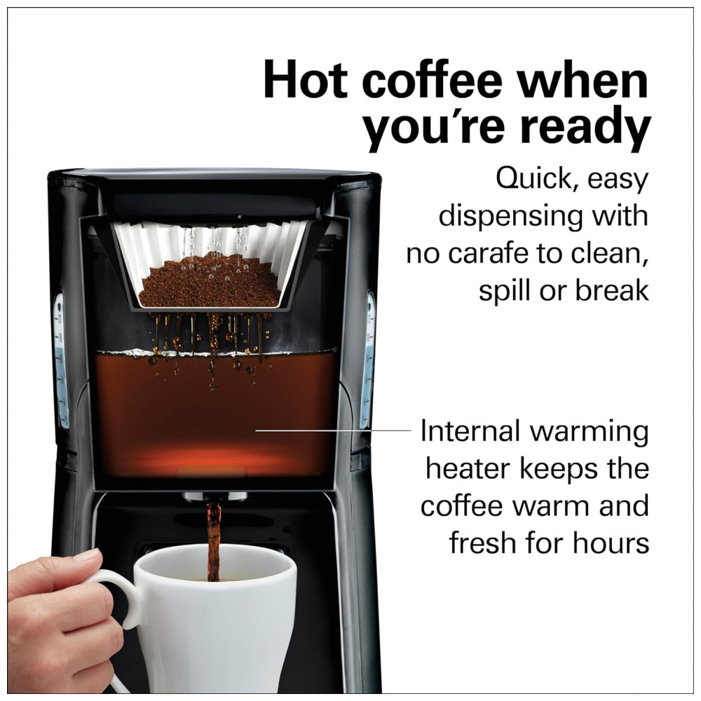 Funciona sem uma jarra ou placa de aquecimento, para que o café não queime ou arraste, e não há jarra para limpar, derramar ou quebrar. O aquecedor de aquecimento interno mantém o café quente e fresco horas após a fabricação da cerveja. O resultado é um café fresco e mais saboroso por um longo período de tempo. A cafeteira distribui café quente diretamente em uma xícara ou caneca de viagem sempre que você estiver pronto para uma xícara. O relógio programável com luz de fundo azul é fácil de ver e pode ser configurado com até 24 horas de antecedência para o café pronto para despertar.