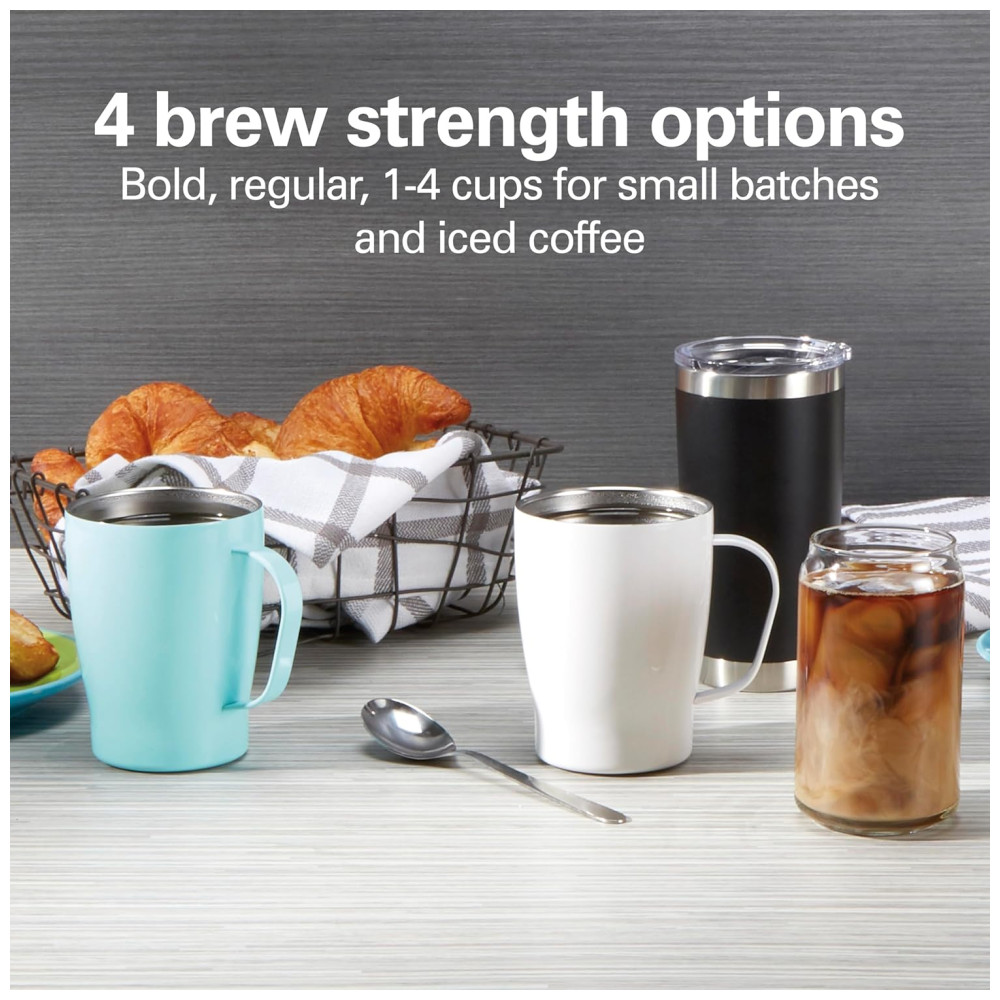 O seletor de força de fermentação possui 4 opções: negrito, regular, 1 4 xícaras para pequenos lotes e café gelado. O relógio programável com luz de fundo azul é fácil de ver e pode ser configurado com até 24 horas de antecedência para o café pronto para despertar.