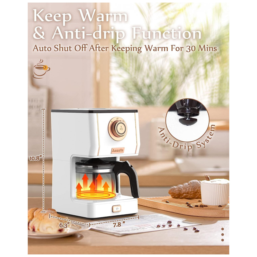QUANDO SE TRATA DE MÁQUINAS DE CAFÉ QUE FUNCIONAM TÃO BEM QUANTO PARECEM, É DIFÍCIL SUPERAR A AMASTE. Nossa máquina de gotejamento manterá seu café acabado de fazer quente por 30 minutos para preservar o sabor após a preparação. Ao mesmo tempo, se não for usada por mais de 30 minutos, a cafeteira será desligada automaticamente para evitar o superaquecimento. Além disso, para ajudá lo a determinar quanto café usar, a jarra de vidro e o tanque de água são marcados com nível