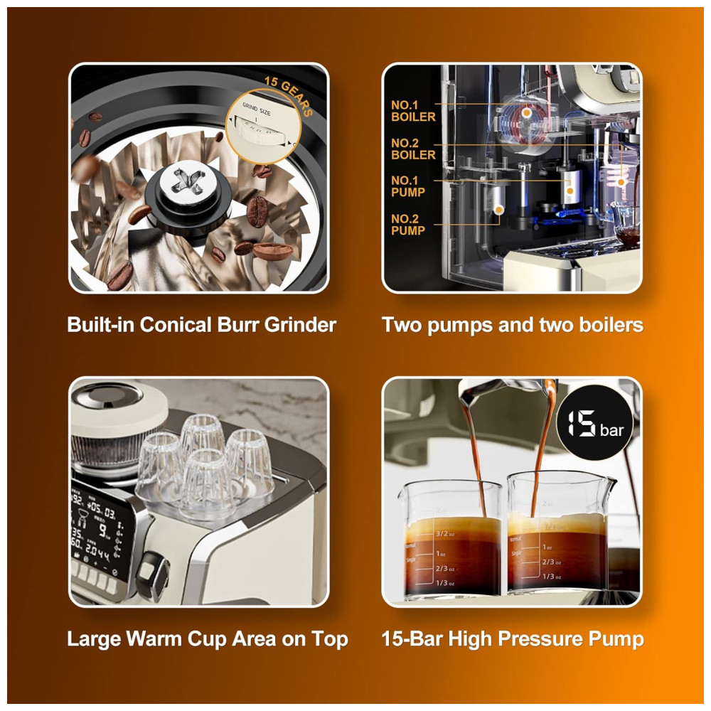 A máquina de café expresso Mcilpoog foi especialmente projetada com uma ampla gama de funções e recursos incríveis. A bomba de água dupla e o design de caldeira dupla permitem que café e espuma de leite sejam produzidos simultaneamente, preparando especialidades de café perfeitas em menos de 60 segundos. O controle digital de temperatura com tecnologia PID controla precisamente a temperatura da água para uma extração de café perfeitamente equilibrada, dando a você o controle e a consistência para um café delicioso todas as vezes.