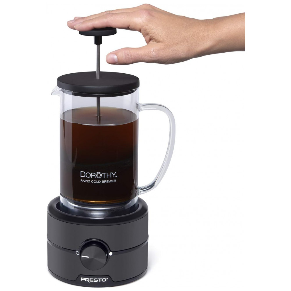 Chega de esperar de 12 a 24 horas. Esta tecnologia de preparação rápida a frio torna o café suave e saboroso, sem sabor amargo, porque os grãos de café nunca são expostos a altas temperaturas. Basta encher a jarra de vidro com água, ajustar a velocidade de preparo e despejar o café moído na banheira de hidromassagem. A água giratória circula rapidamente os grãos de café para extração completa do sabor em apenas 15 minutos. Após a preparação, pressione o êmbolo para filtrar o café. A cafeteira gelada rápida Dorothy é a maneira rápida e fácil de preparar 650 mL de sua bebida gelada favorita para desfrutar imediatamente. A jarra, o filtro e o copo de borra podem ser lavados na máquina de lavar louça e o cabo se desconecta da base de alimentação