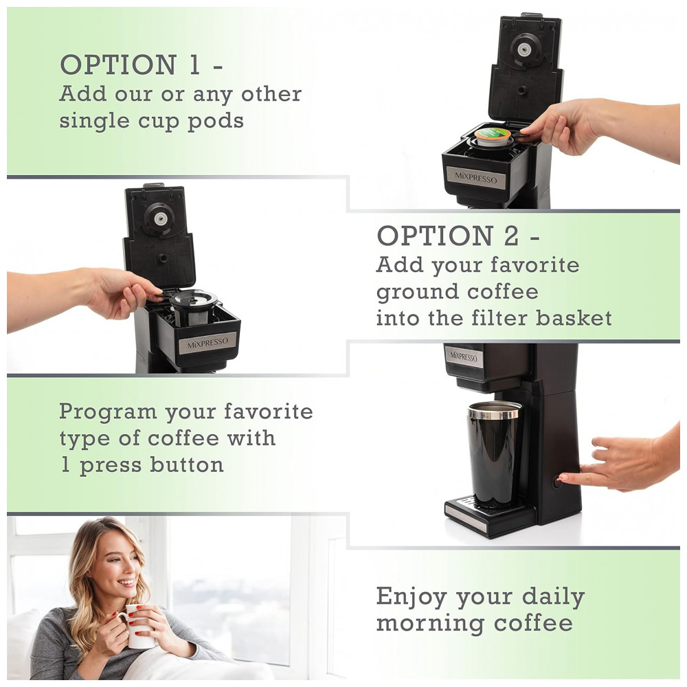 2 EM 1: Nossa cafeteira de dose única é exatamente o que você precisa para começar seu dia de forma produtiva e com uma nota alta Escolha café moído ou cápsulas de xícara única, e nossa cafeteira de dose única compatível com xícara pode preparar quase instantaneamente sua marca favorita de café moído com nossa tecnologia de preparação rápida