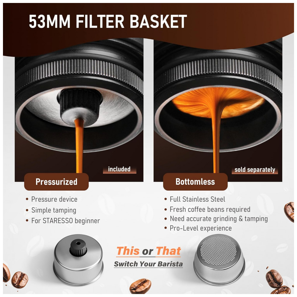 Material de alta qualidade: A máquina de café expresso portátil STARESSO usa material de silicone com o mesmo nível de segurança das mamadeiras, e todas as peças de metal são feitas de aço inoxidável 304 de qualidade alimentar. A superfície da bomba adota revestimento nanocerâmico de nível aeroespacial, a durabilidade da bomba é aumentada três vezes e é muito resistente e durável.