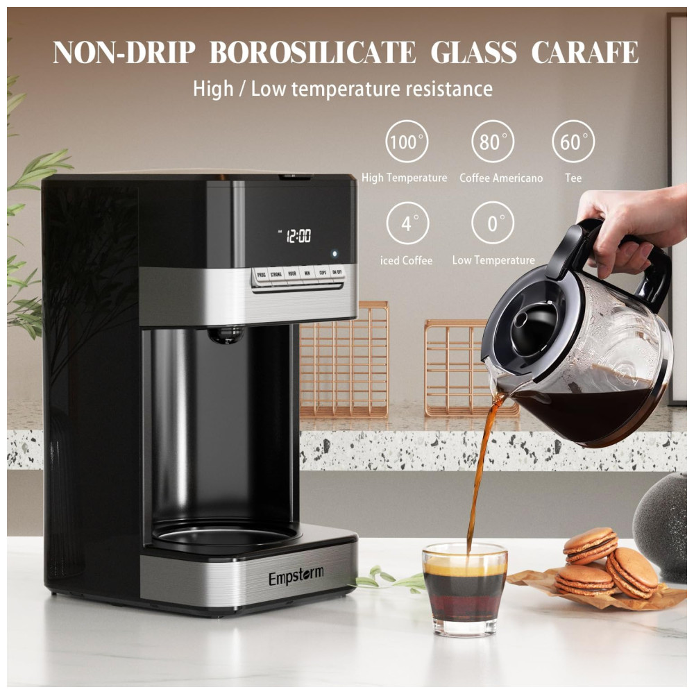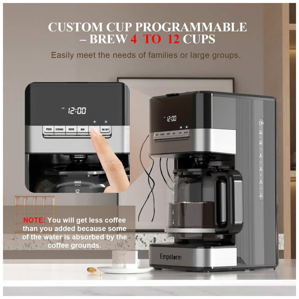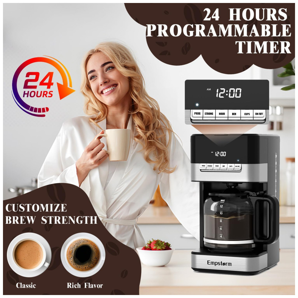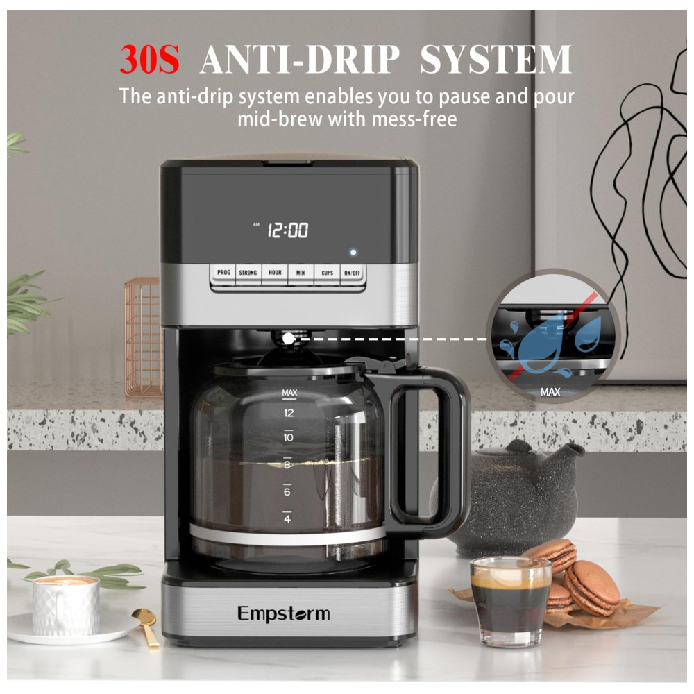 Máquina de Café Programável 12 xícaras com Jarra de Vidro Desligamento Automático e Sistema Anti-Gotejamento 110V 1000W Empstorm Preta e Prata
