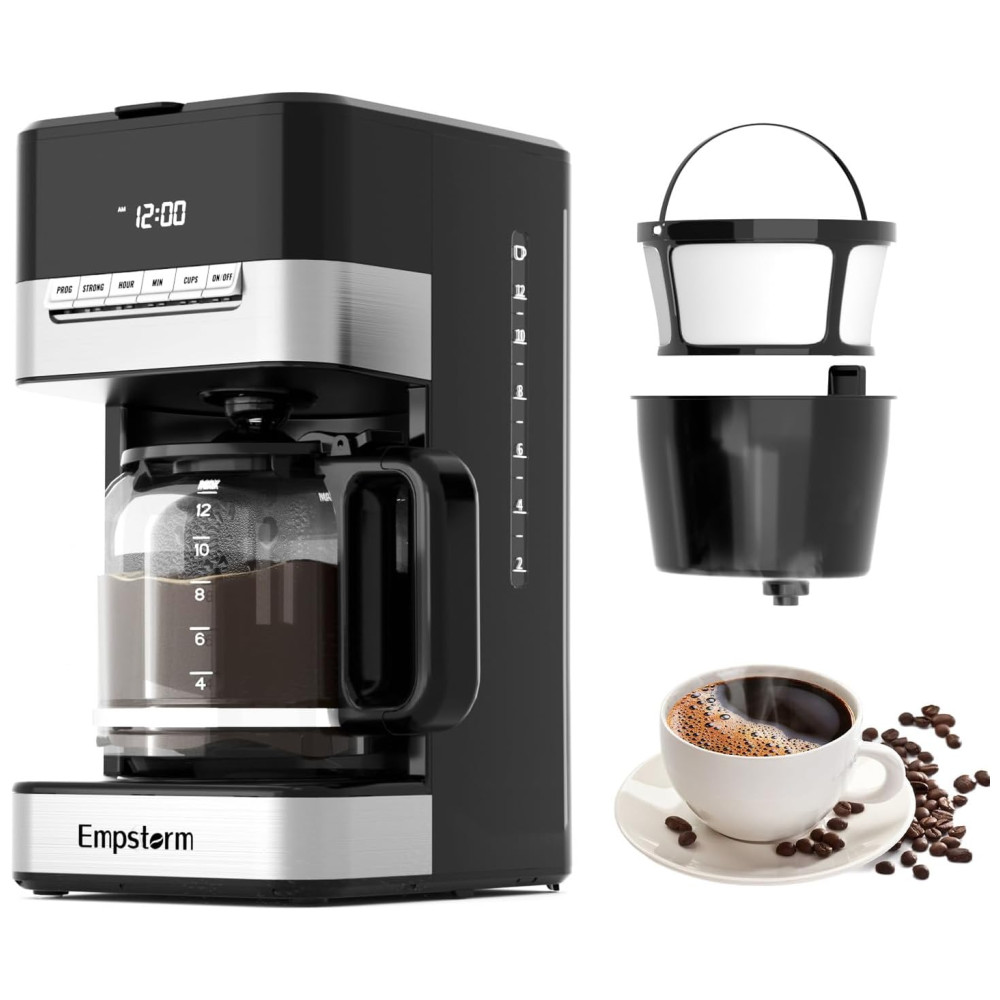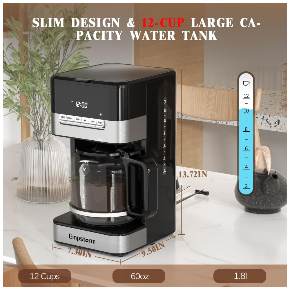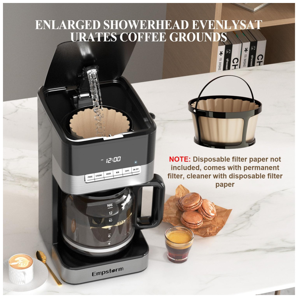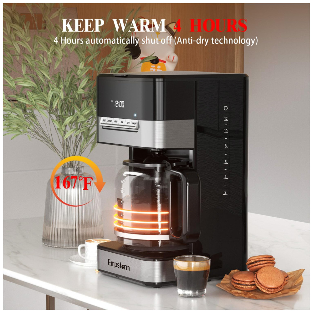 Máquina de Café Programável 12 xícaras com Jarra de Vidro Desligamento Automático e Sistema Anti-Gotejamento 110V 1000W Empstorm Preta e Prata