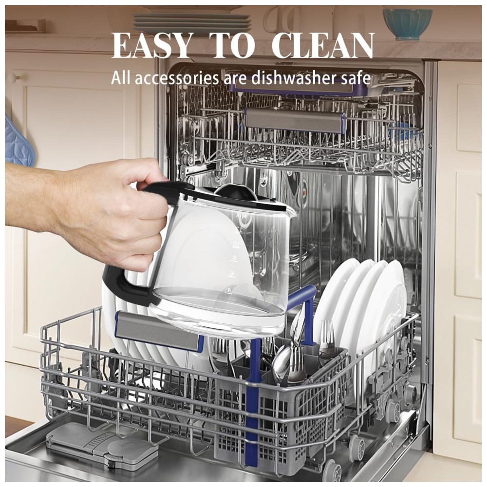 O recurso anti gotejamento permite que você retire a jarra de vidro e sirva uma xícara de café imediatamente, sem precisar esperar pela preparação completa. A cafeteira é fácil de limpar, pois tanto o funil quanto a jarra de vidro podem ser lavados na máquina de lavar louça. E para garantir a qualidade do café, basta fazer 2 ou 3 ciclos de água fria antes de preparar a primeira xícara ou após vários usos.