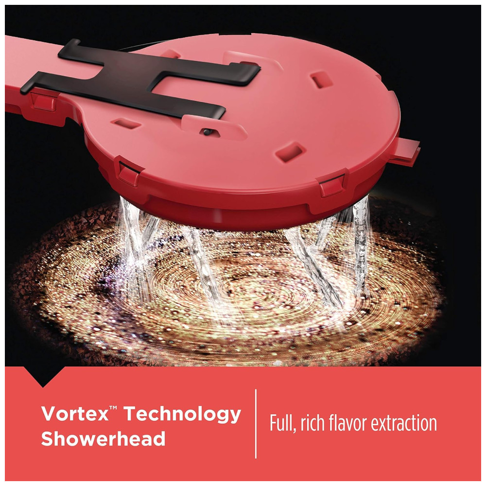 TECNOLOGIA VORTEX NO CHUVEIRO: O design exclusivo do chuveiro satura uniformemente o pó de café, resultando em uma extração de sabor rica.