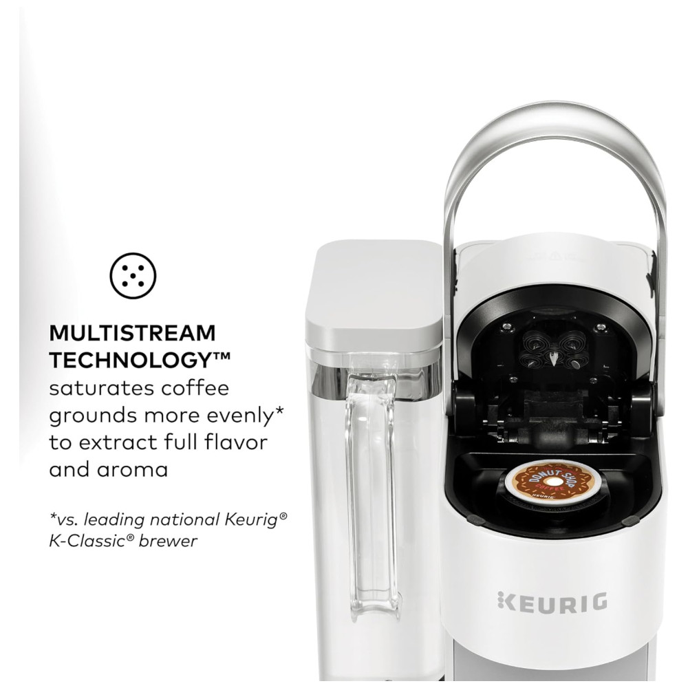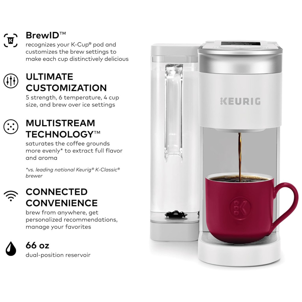 O reservatório de dualposição permite preparar até nove xícaras antes de reabastecer e é amigável com canecas de viagem de até 7 polegadas de altura. O aplicativo Keurig permite preparar café de qualquer lugar, agendar, personalizar suas configurações, criar e salvar configurações favoritas e usar o Voice Assist para preparar remotamente.