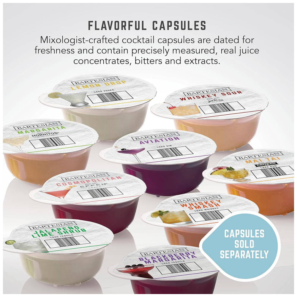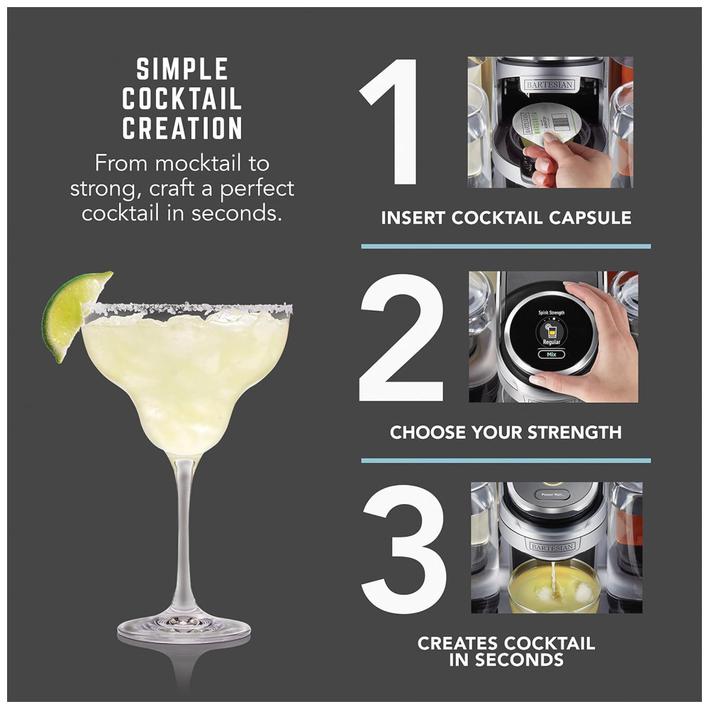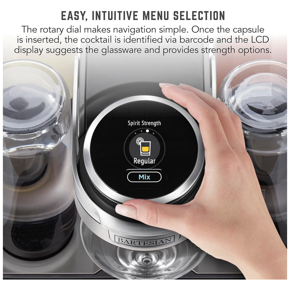A beleza do Bartesian Professional, ele é rápido e fácil de usar, para que qualquer pessoa possa preparar um coquetel perfeito em segundos. Basta inserir uma cápsula na máquina, colocar o copo de coquetel no tapete do bar e escolher a concentração preferida, de mocktail a forte. Em segundos, o Bartesian Professional extrai o espírito da garrafa apropriada e prepara um coquetel fresco e delicioso.