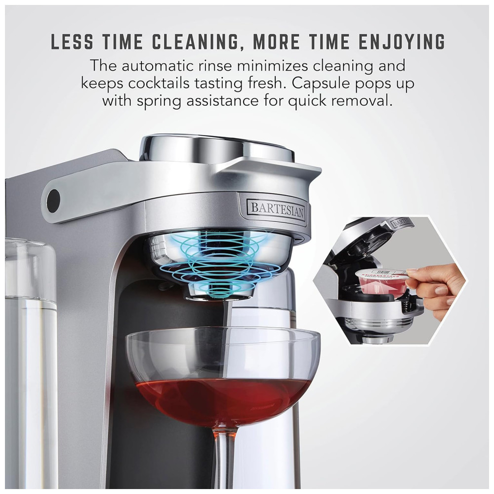 O enxágue automático minimiza a limpeza e evita que os ingredientes do coquetel anterior se misturem com o seguinte. As cápsulas saltam com auxílio de mola para remoção rápida e as garrafas de vidro podem ser lavadas na máquina de lavar louça.