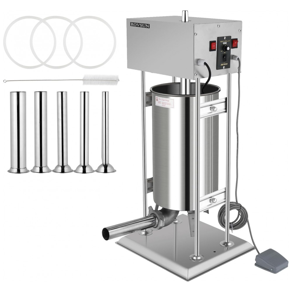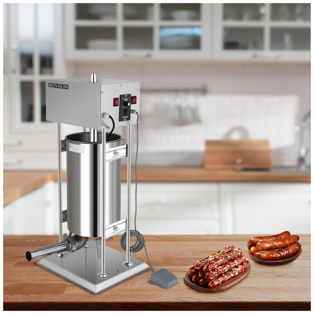 Máquina de Enchimento de Linguiças Elétrica ROVSUN 10L – Aço Inoxidável Design Vertical Velocidade Ajustável 5 Tubos de Enchimento Uso Residencial