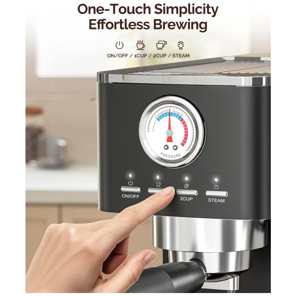 O painel possui comandos simplificados por botão único e alertas visuais; o ciclo oferece aquecimento em até 60 segundos, preparo do espresso simples em 20 segundos e duplo em menos de 30 segundos. O vaporizador profissional gera vapor potente para texturização de leite e microespuma adequada para cappuccinos, lattes e latte art, operando em conjunto com todos os modos de extração. O reservatório removível de 1,3 litro facilita abastecimento e lavagem; bandeja coletora removível (base) permite limpeza ágil.