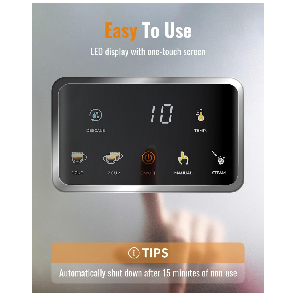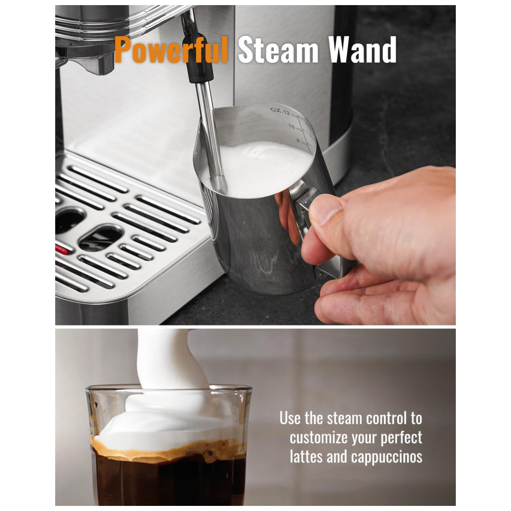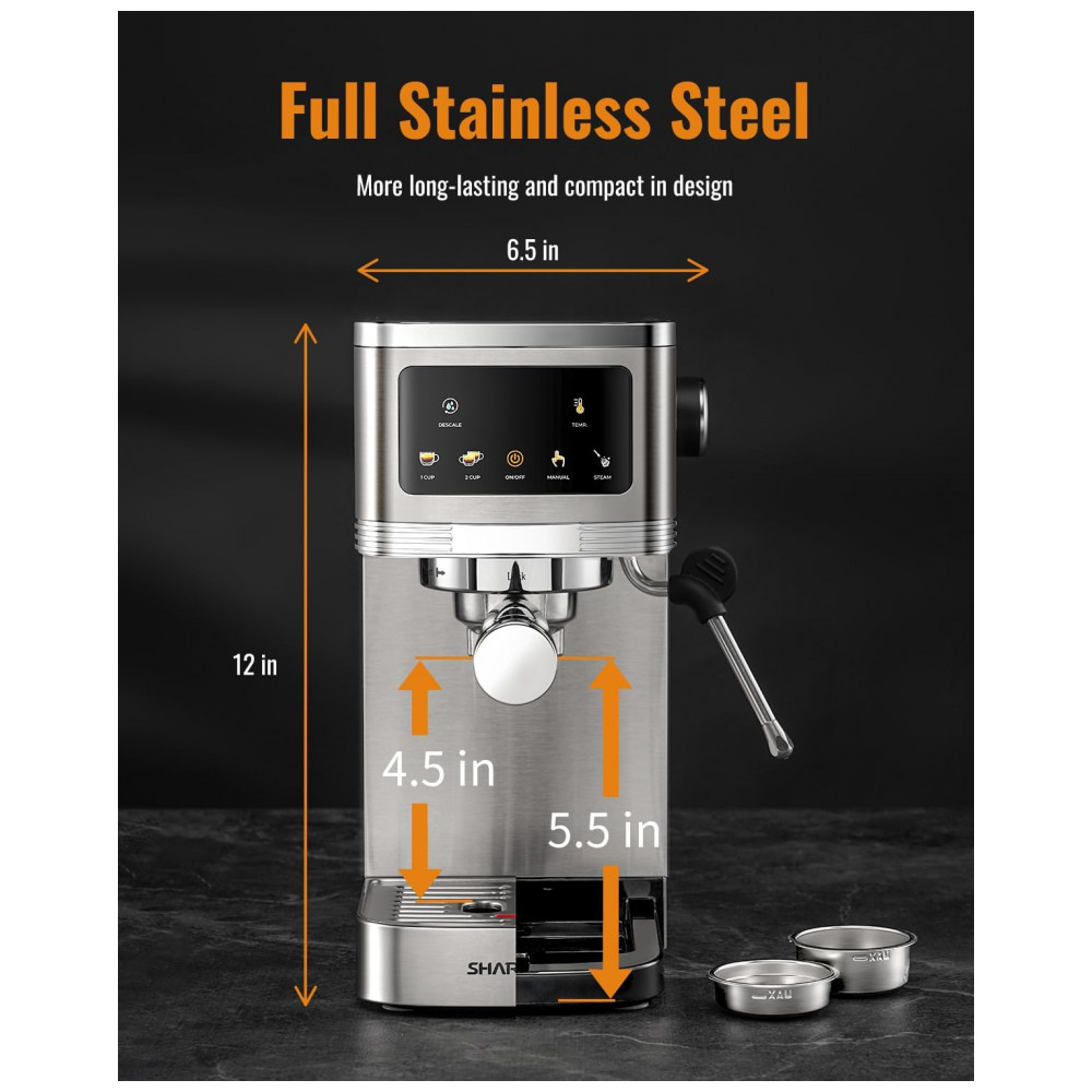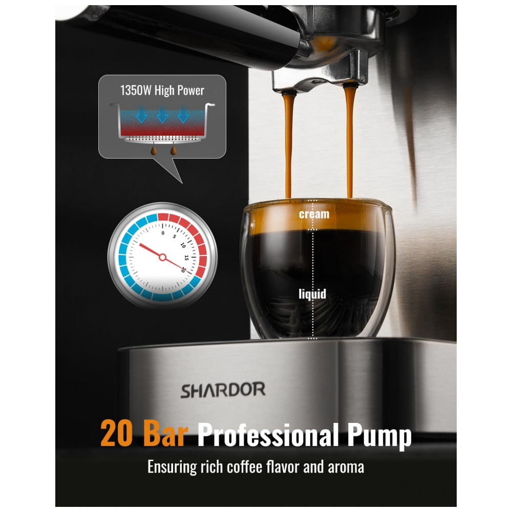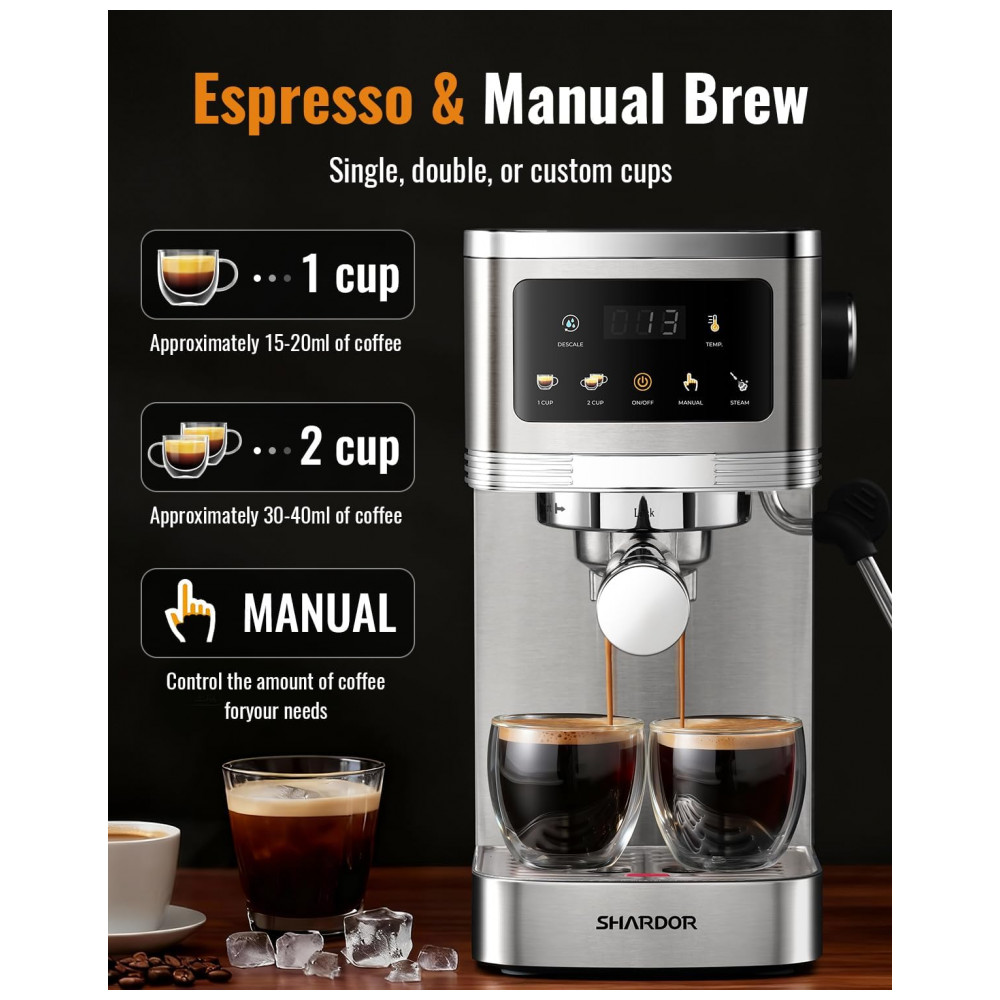 Máquina de Espresso 20 Bar SHARDOR Prata Inox Touchscreen Vaporizador de Leite Controle de Temperatura 110V