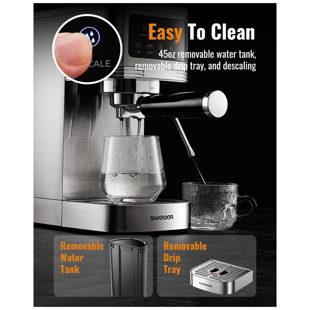 A máquina de espresso SHARDOR CM1661 é um equipamento semiautomático para uso doméstico e em escritório, com bomba de 20 bar e motor de 1350W para extração de café espresso com crema estável. O sistema de controle de temperatura com três níveis permite ajustar a temperatura de extração conforme a preferência de uso. O painel touchscreen com display LED oferece seleção de dose simples ou dupla, modo manual para controlar a quantidade de café, função de descalcificação, controle de temperatura, vapor com um toque e desligamento automático após 15 minutos de inatividade.
