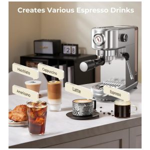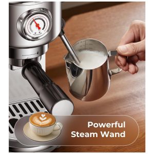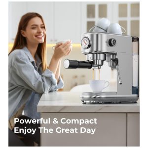 O vaporizador profissional de leite (steam wand) entrega microespuma para cappuccinos, lattes e latte art, com fluxo regulável, sendo fácil de limpar e robusto para uso diário. A bandeja de resíduos removível, assim como o reservatório de água de 1,3 litro (44,4 oz), permitem limpeza rápida e abastecimento prático, reduzindo o tempo de manutenção. O topo em aço inox também serve como aquecedor de xícaras, mantendo bebidas na temperatura ideal por mais tempo.