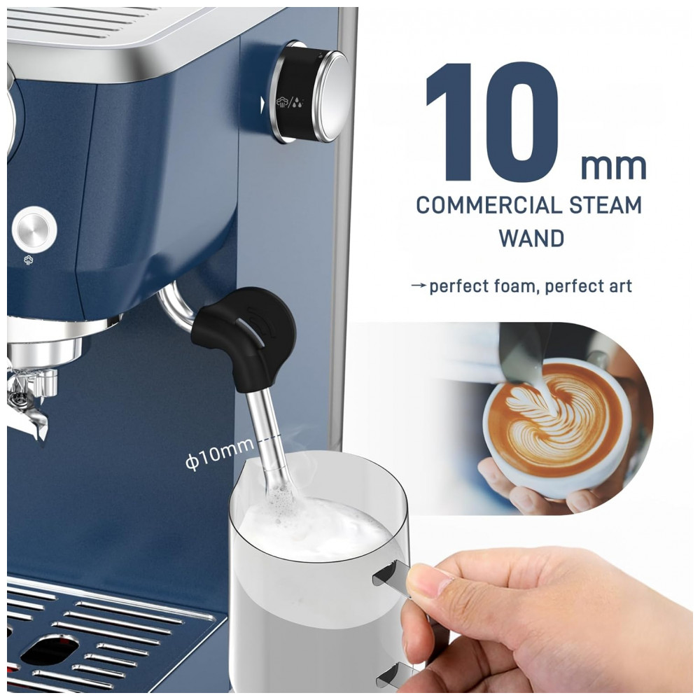 O vaporizador profissional de 10 mm em aço inoxidável é projetado para criar espuma de leite densa e aveludada, perfeita para cappuccinos, lattes e latte art, com controle preciso da intensidade do vapor via botões. A cafeteira possui manômetro colorido que indica visualmente a faixa de pressão ideal durante a extração, facilitando o controle do processo mesmo para iniciantes.