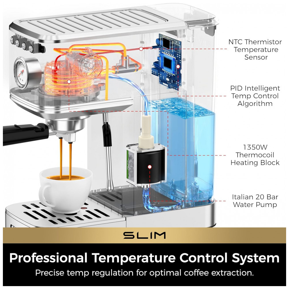 O controle de temperatura com proteção NTC oferece estabilidade térmica constante, enquanto a pré-infusão automática umedece de forma homogênea o pó de café antes da extração, resultando em bebidas com mais corpo e acidez equilibrada. O manômetro frontal permite monitoramento em tempo real da pressão, favorecendo ajustes para diferentes estilos de café; espressos, cappuccinos, macchiatos, lattes e até opções geladas.