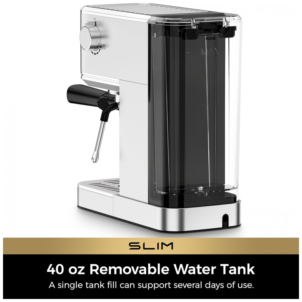 O vaporizador profissional (steam wand) em aço inox proporciona vapor de alta potência, permitindo texturizar leite para lattes art, cappuccinos e mochas com microespuma densa e cremosa. O reservatório de água removível de 1,18 litro (40 oz) permite dezenas de extrações sem necessidade de reabastecimento frequente, e a bandeja coletora também é removível para facilitar a higienização. O topo metálico funciona como aquecedor de xícaras para servir todas as bebidas na temperatura ideal.