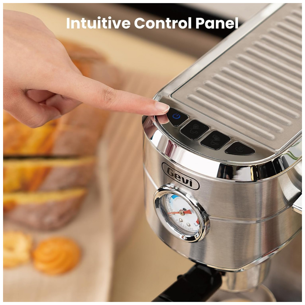 A Gevi ECMG0-WH0A1 é uma máquina de espresso semiautomática robusta, desenhada tanto para uso residencial quanto comercial. Seu sistema de bomba italiana de 20 bar garante extração eficiente do café moído, proporcionando espressos intensos, aromáticos e encorpados com crema densa. A temperatura é regulada automaticamente via sensor NTC para máxima estabilidade térmica durante os ciclos de preparo e vaporização.
