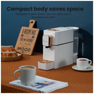 Máquina de espresso compacta de dose única projetada para uso com cápsulas compatíveis com o sistema Nespresso OriginalLine, incluindo Bestpresso, Peet’s Espresso e outras marcas equivalentes. Opera com bomba de 19 bar, reservatório removível de 0,8 L, dimensões reduzidas e painel com dois botões programáveis para preparo de espresso curto e lungo.