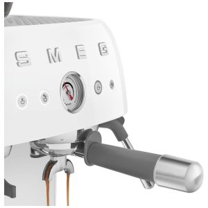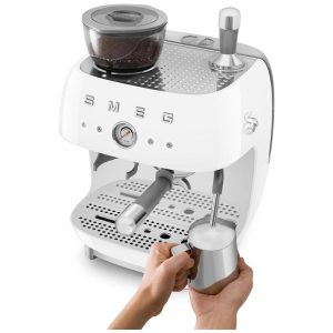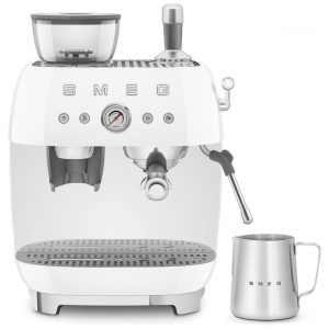 Máquina de espresso semi‑automática Smeg branca retrô com moedor integrado duplo termobloco porta‑filtro 58 mm e reservatório 24L 110V