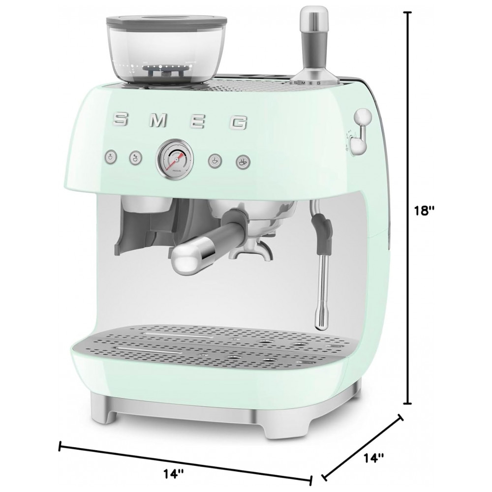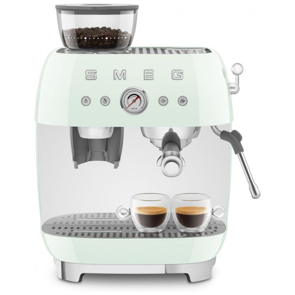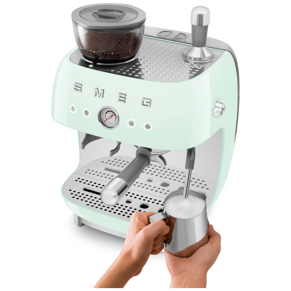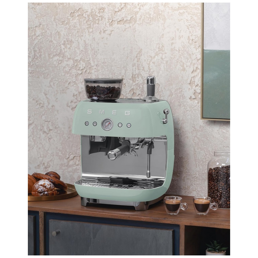 Máquina de espresso semi‑automática Smeg verde pastel retrô com moedor integrado duplo termobloco porta‑filtro 58 mm e reservatório 24L 110V