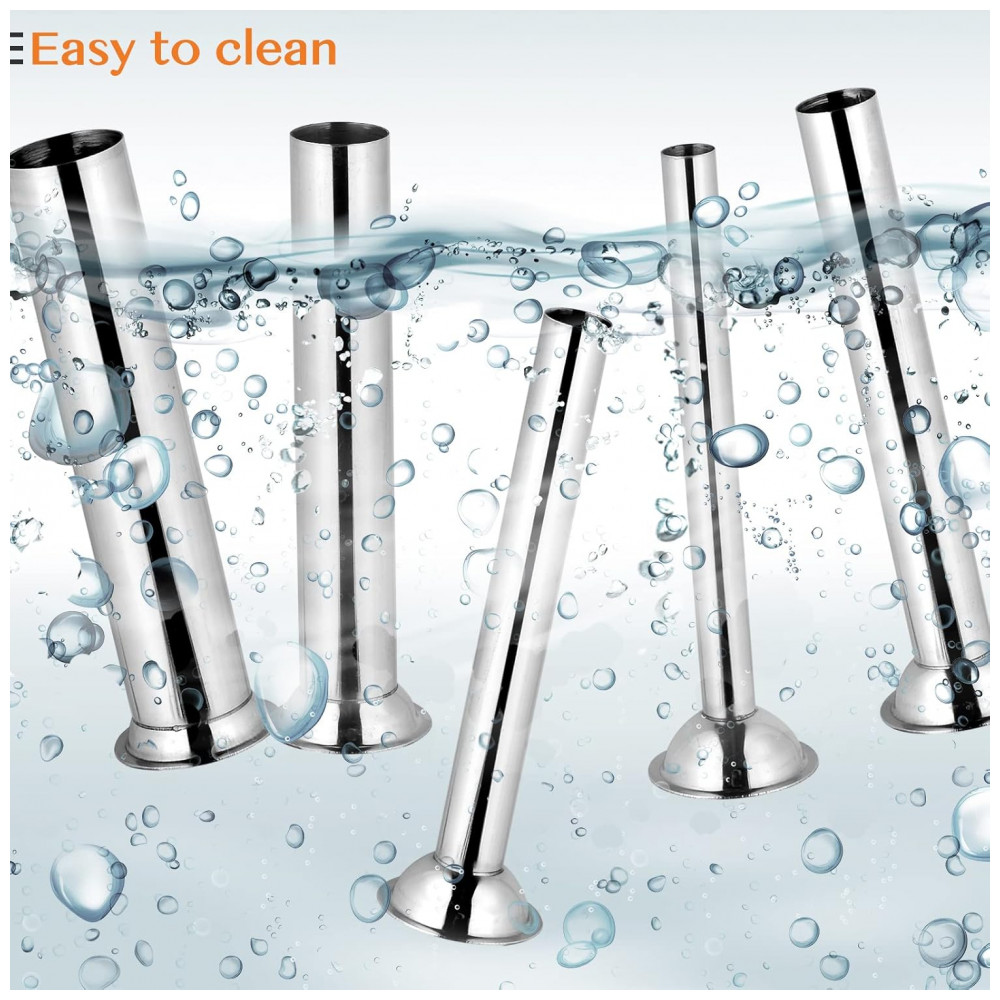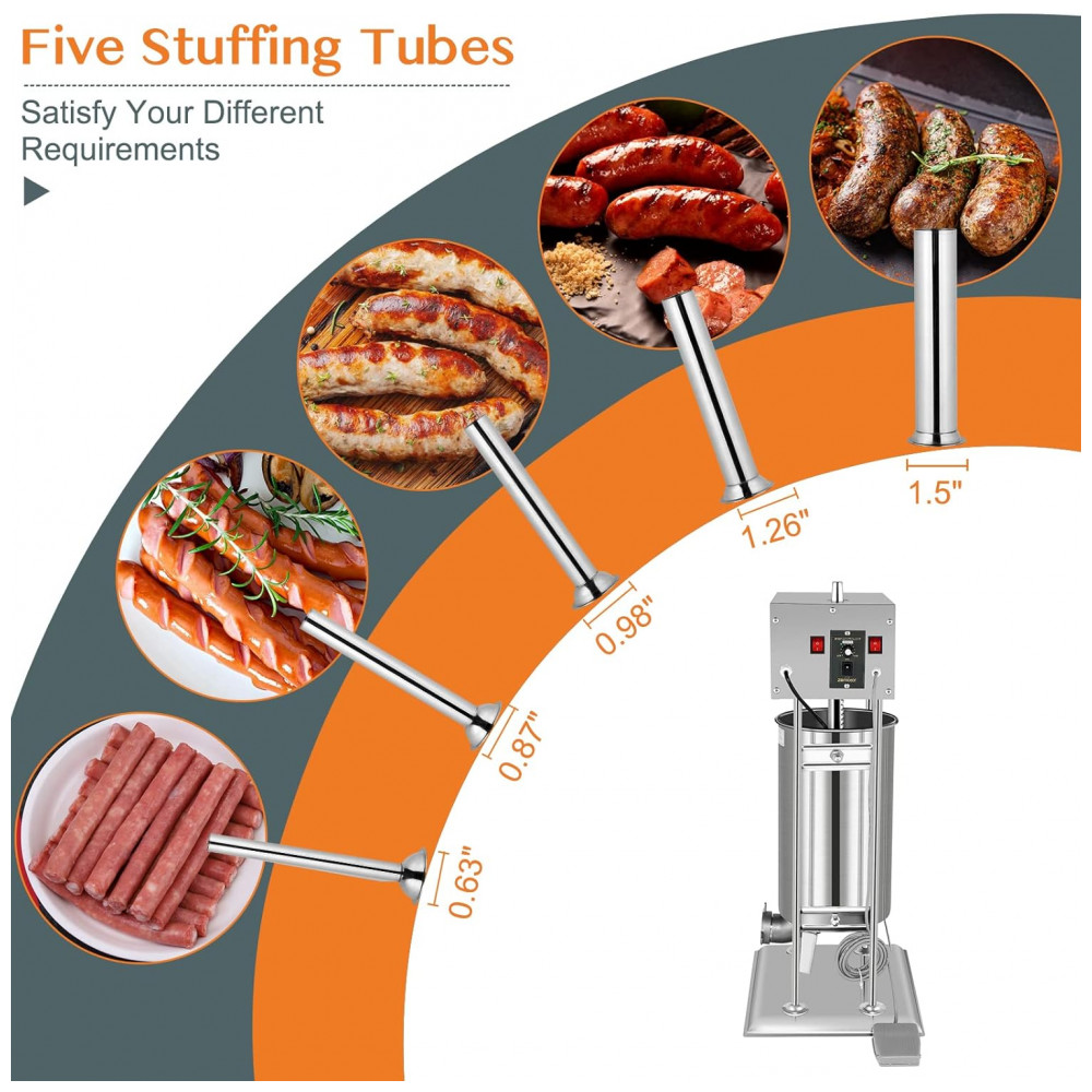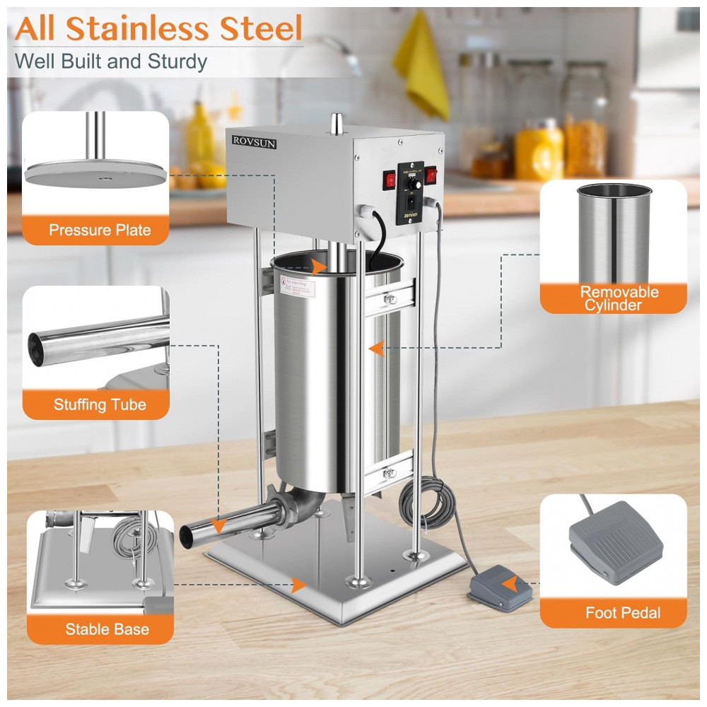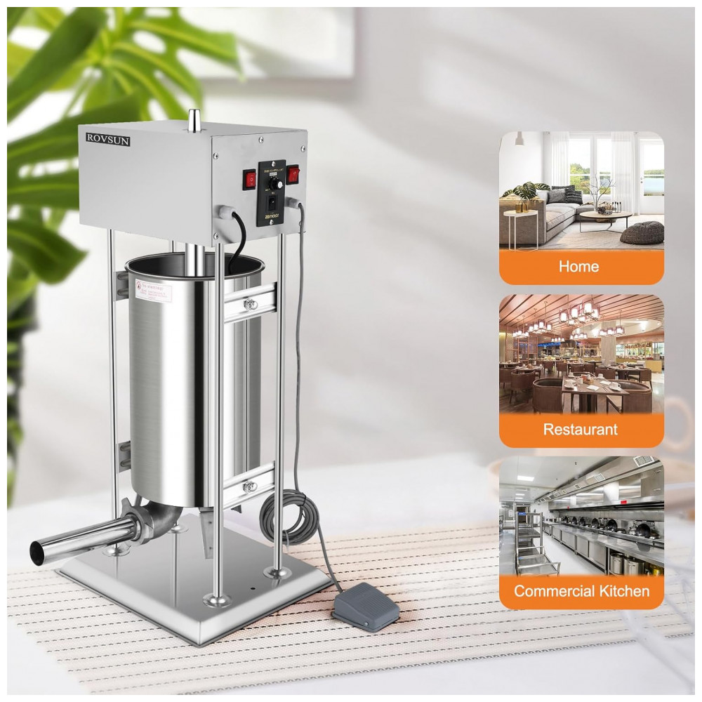 A Máquina de Fazer Linguiça Elétrica da ROVSUN é feita com materiais de alta qualidade, como estrutura, base, cilindro e tubos em aço inoxidável, duráveis e à prova de corrosão. A capacidade de 15 litros permite processar grandes quantidades de carne de forma eficiente. Com 11 velocidades ajustáveis, pedal de controle e design desmontável, torna o processo de fazer linguiças fácil, prático e sem esforço. Inclui 5 tubos de enchimento em aço inoxidável de tamanhos variados, ideais para fazer diferentes tipos de linguiças. Perfeita para uso doméstico em cozinhas e também para uso comercial em supermercados, açougues e restaurantes.