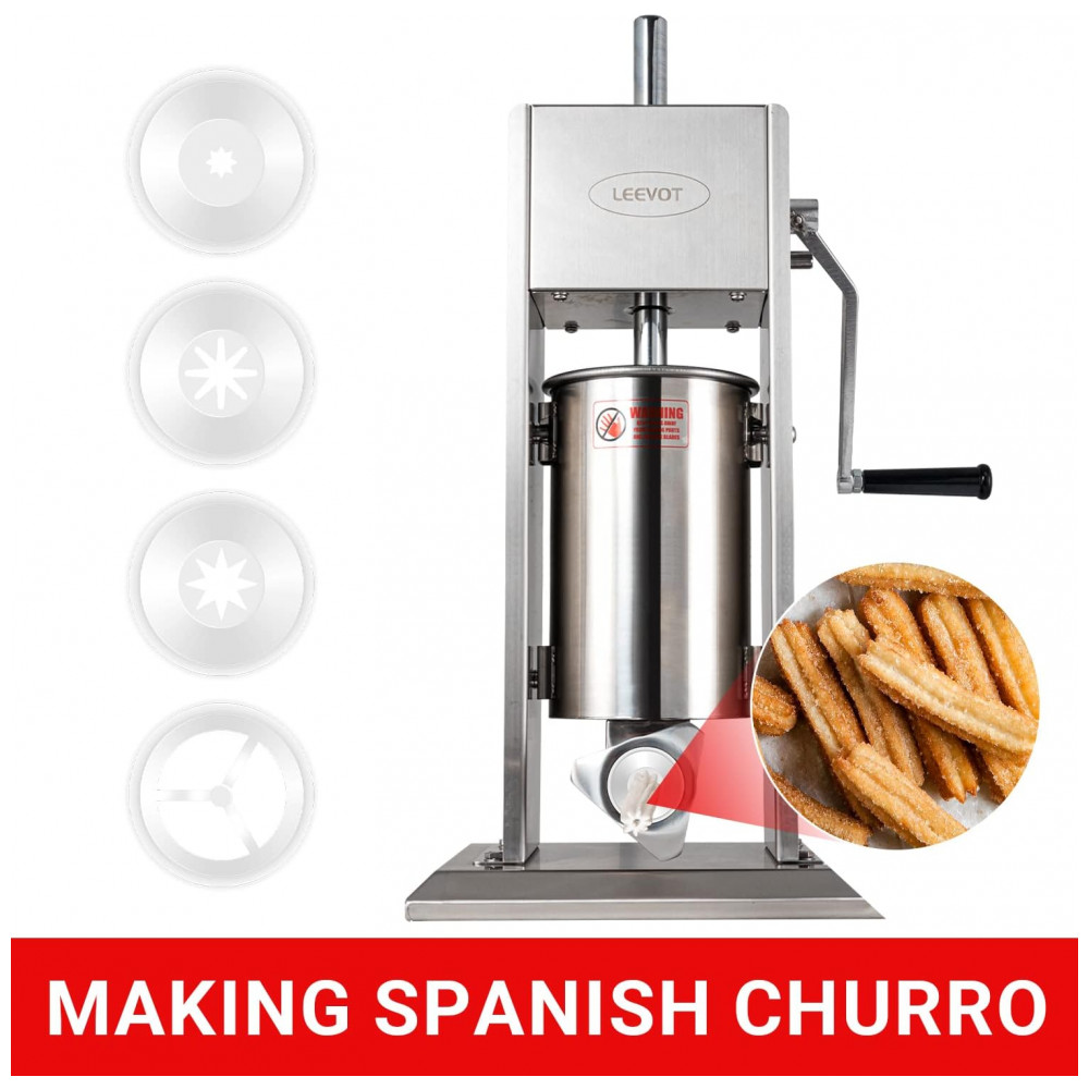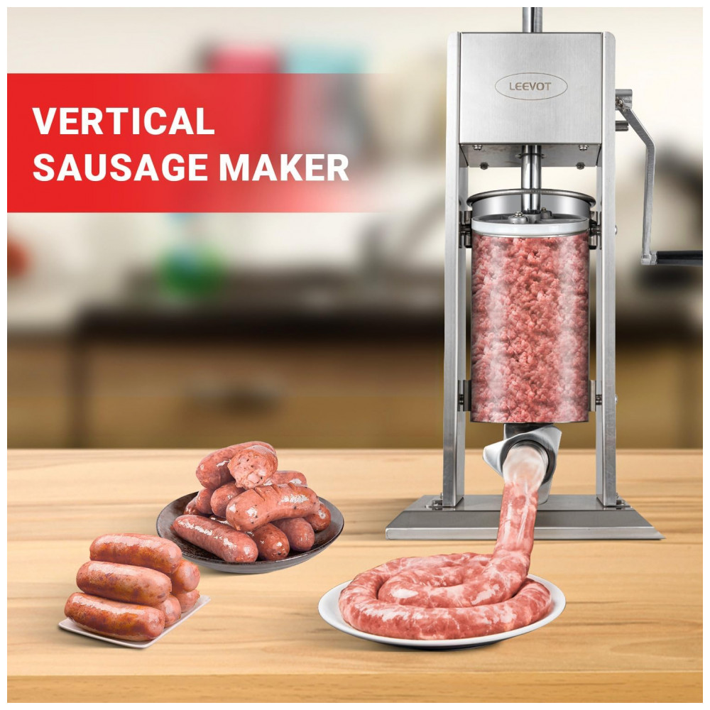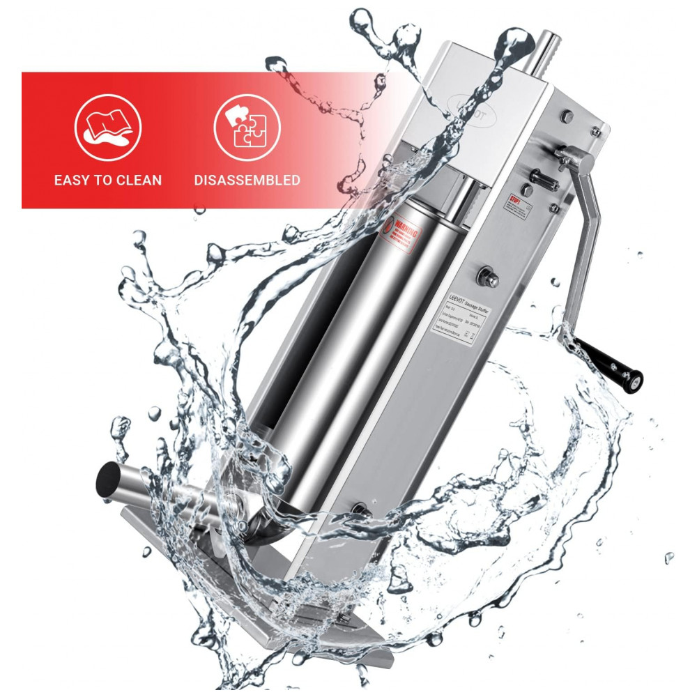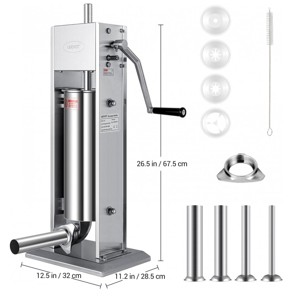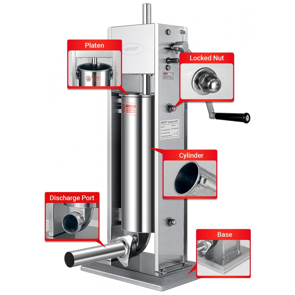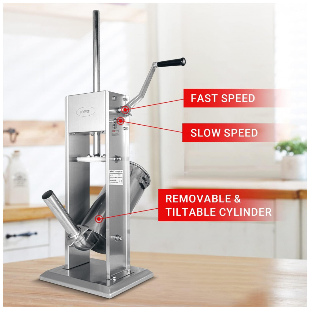 A máquina de fazer linguiças LEEVOT possui duas velocidades de enchimento, alça reguladora removível, alta velocidade para enchimento de linguiças e baixa velocidade para embutir em tripa, fácil de operar. Com capacidade de 5 litros, reduz o número de enchimentos necessários, sendo um parceiro essencial para sua casa ou negócio. Design requintado com válvula de pistão bidirecional para evitar quebra, partes removíveis para limpeza facilitada. Acompanha 4 tubos de enchimento em aço inoxidável para atender diferentes necessidades de tamanhos, garantindo segurança alimentar em conformidade com os padrões internacionais.