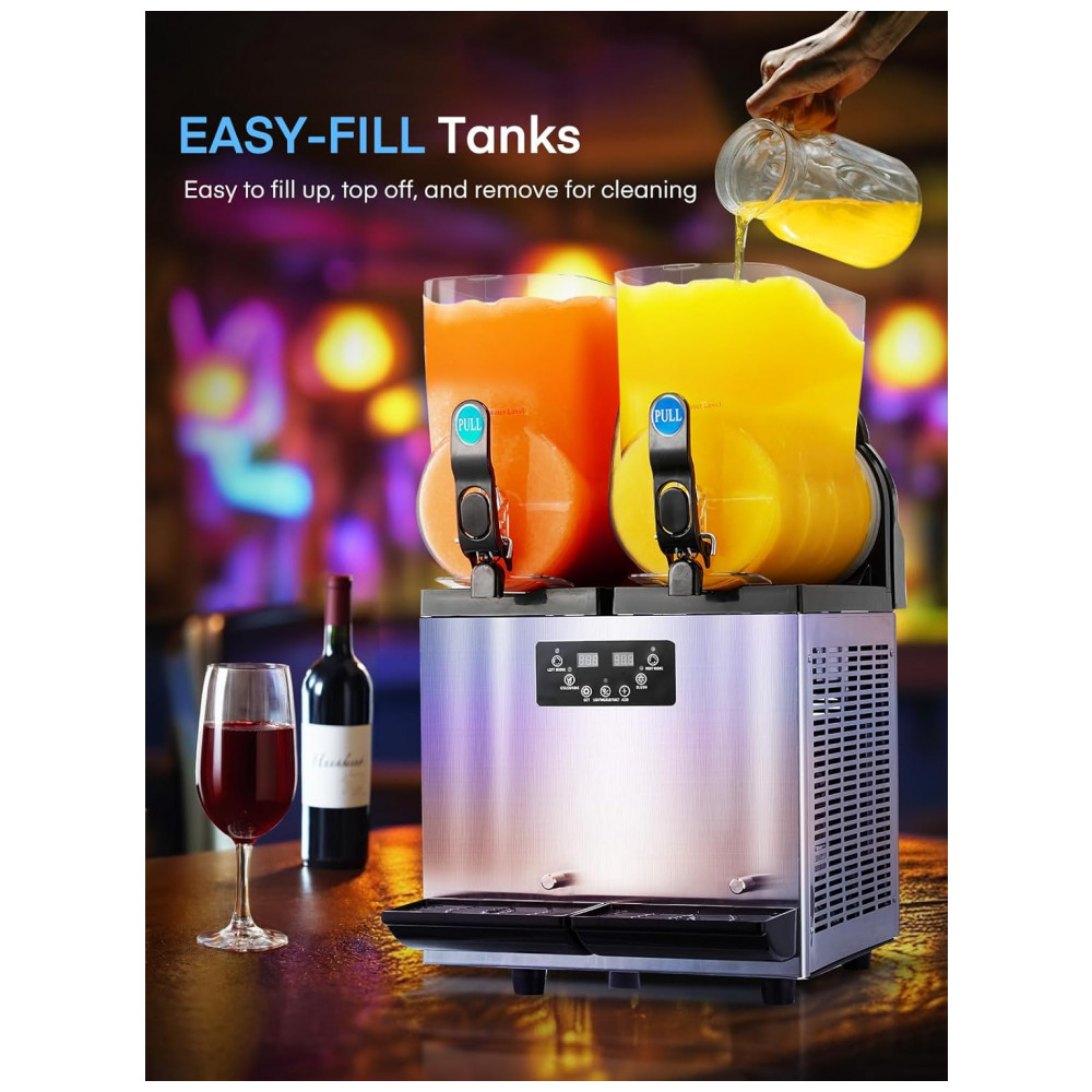 Com tanques de alimentos duplos de 15 litros, esta máquina de frozen comercial produz até 85 copos de 340 ml de slushies por ciclo. As tampas de fácil acesso permitem recargas rápidas, sendo ideal para ambientes de alta demanda. Controle independente de temperatura em cada tanque no intervalo de 0 a 9 para ajustar a consistência, textura e sabor. Perfeita para criar duas bebidas congeladas simultaneamente, desde frappes a slushies. Equipada com compressor Embraco premium, entrega slushies prontos em apenas 25-30 minutos, até 2x mais rápido do que compressores genéricos. O design do helicóptero garante congelamento uniforme e mistura ideal, garantindo bebidas perfeitamente texturizadas lote após lote. Os tanques coloridos com LED realçam suas criações, aumentando a visibilidade do produto para cativar clientes. Ideal para restaurantes, food trucks, bares, etc.