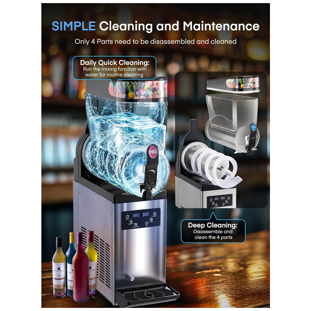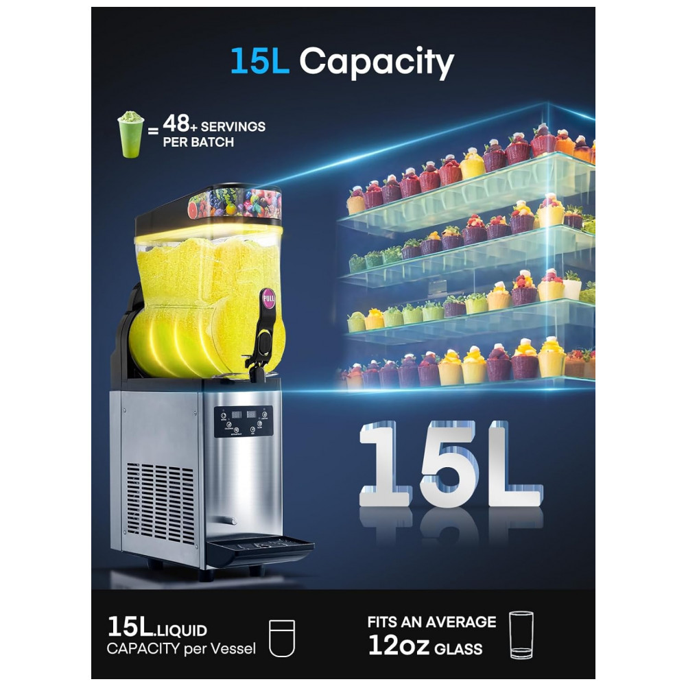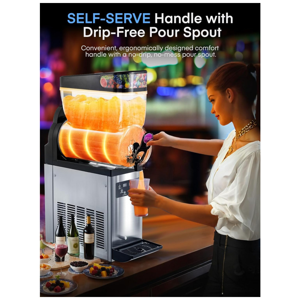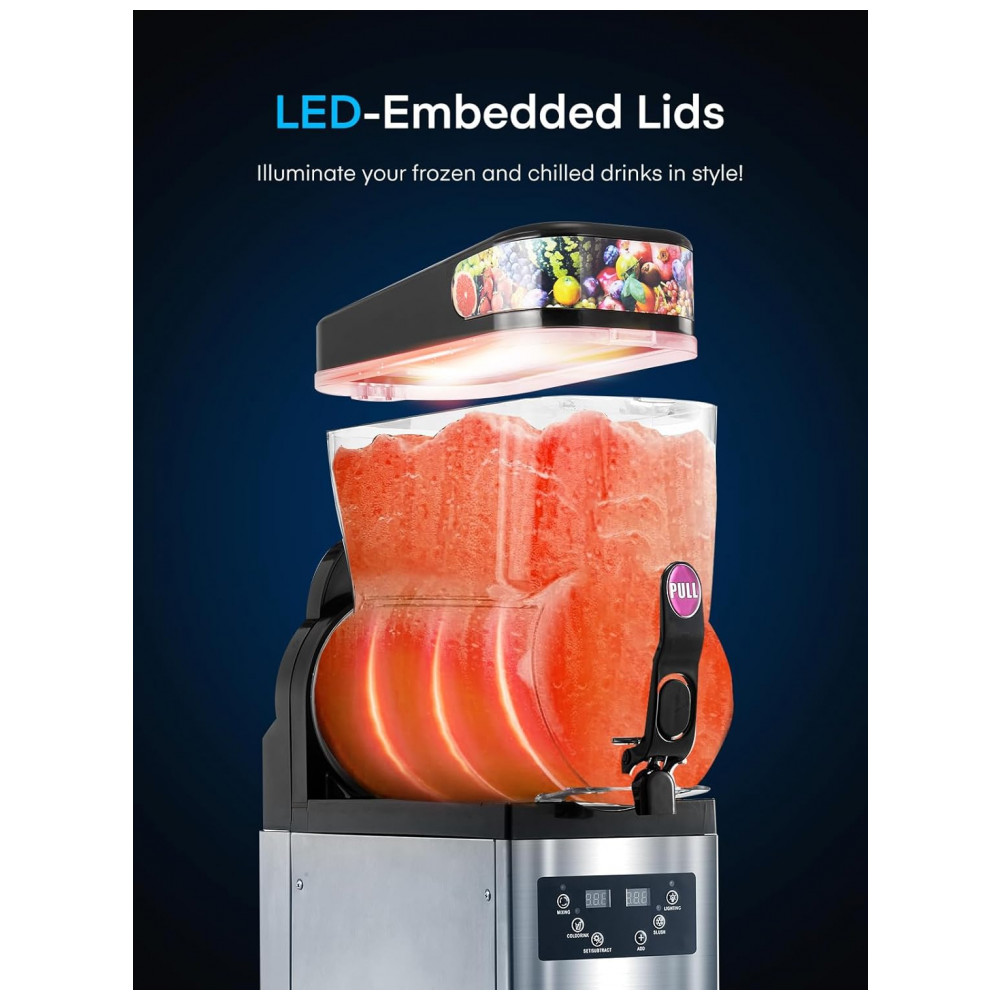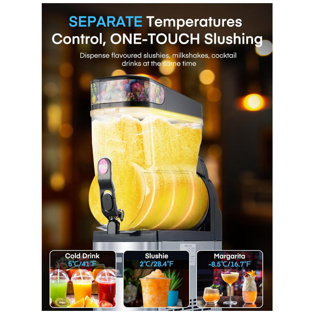 Máquina de Frozen Comercial de Aço Inoxidável 2 Tanques de 15L Prepara até 85 Copos de 350ml por Ciclo Controle de Temperatura Preciso de 0 a 9